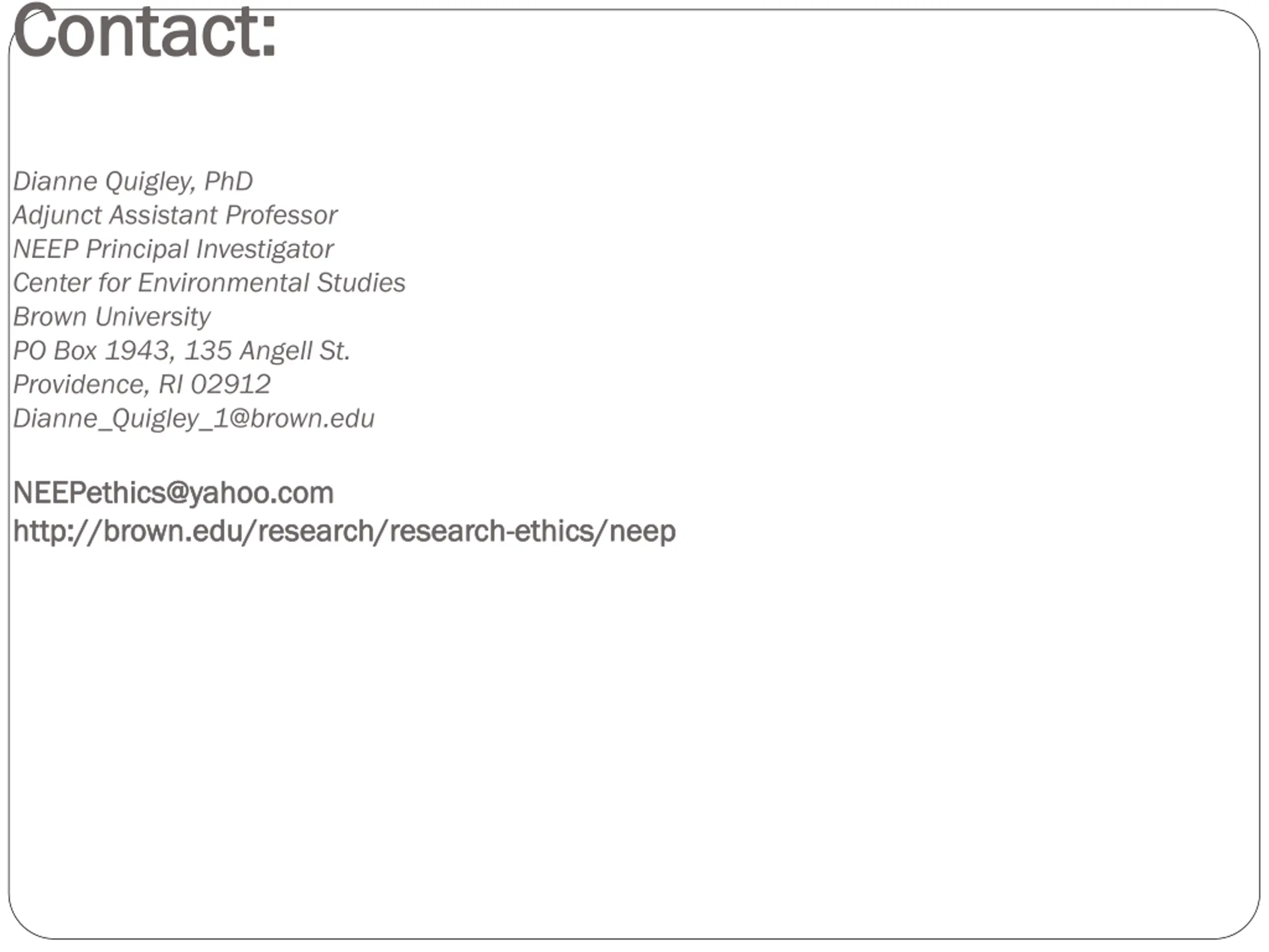 Contact: Contact: Dianne Quigley, PhD Adjunct Assistant Professor NEEP Principal Investigator Center for Environmental Studies Brown University PO Box 1943, 135 Angell St. Providence, RI 02912 Dianne_Quigley_1@brown.edu NEEPethics@yahoo.com NEEPethics@yahoo.com http://brown.edu/research/research http://brown.edu/research/research- -ethics/neep ethics/neep