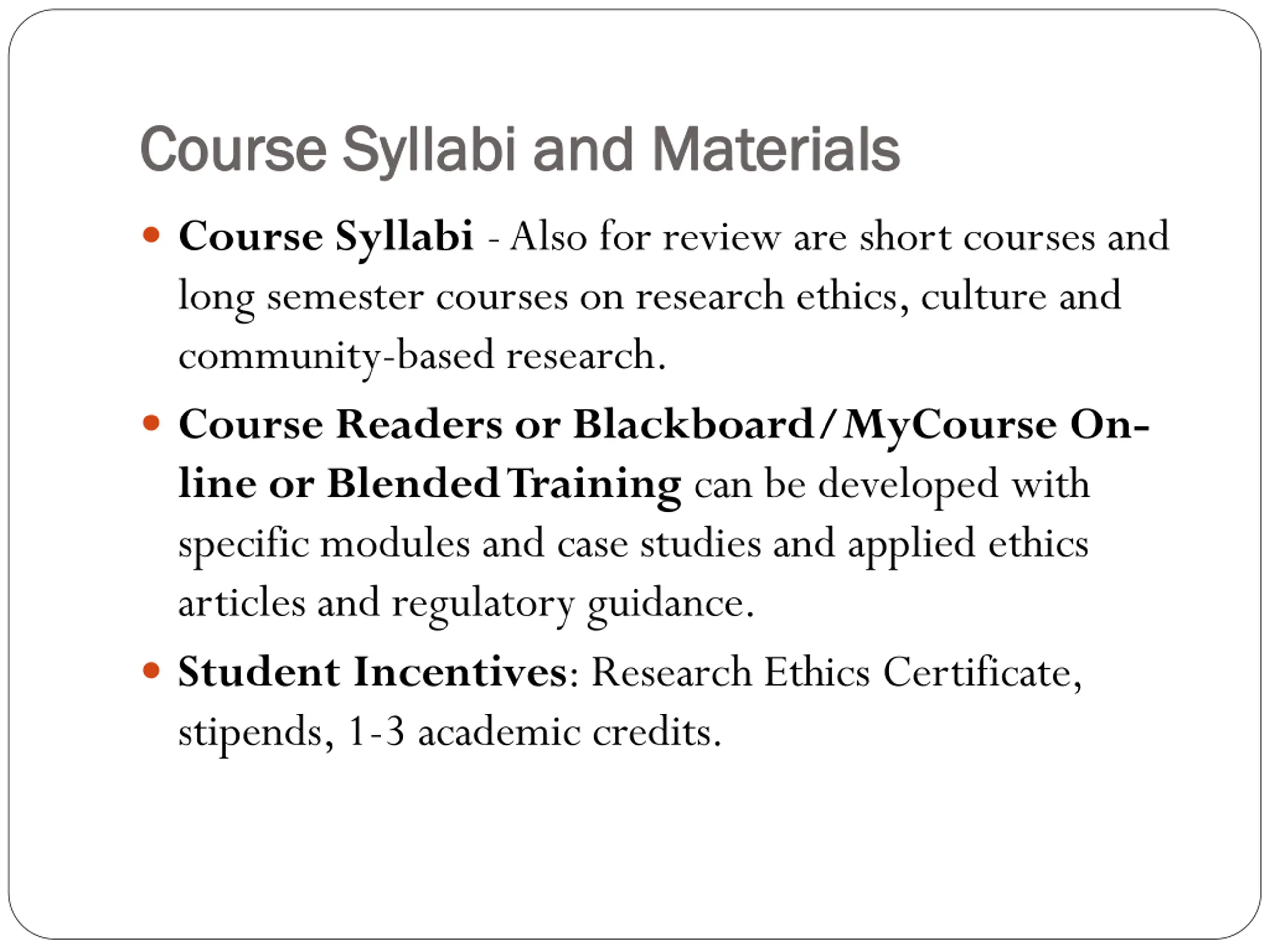 Course Syllabi and Materials Course Syllabi and Materials Course Syllabi -Also for review are short courses and long semester courses on research ethics, culture and community-based research. Course Readers or Blackboard/MyCourse On- line or Blended Training can be developed with specific modules and case studies and applied ethics articles and regulatory guidance. Student Incentives: Research Ethics Certificate, stipends, 1-3 academic credits.