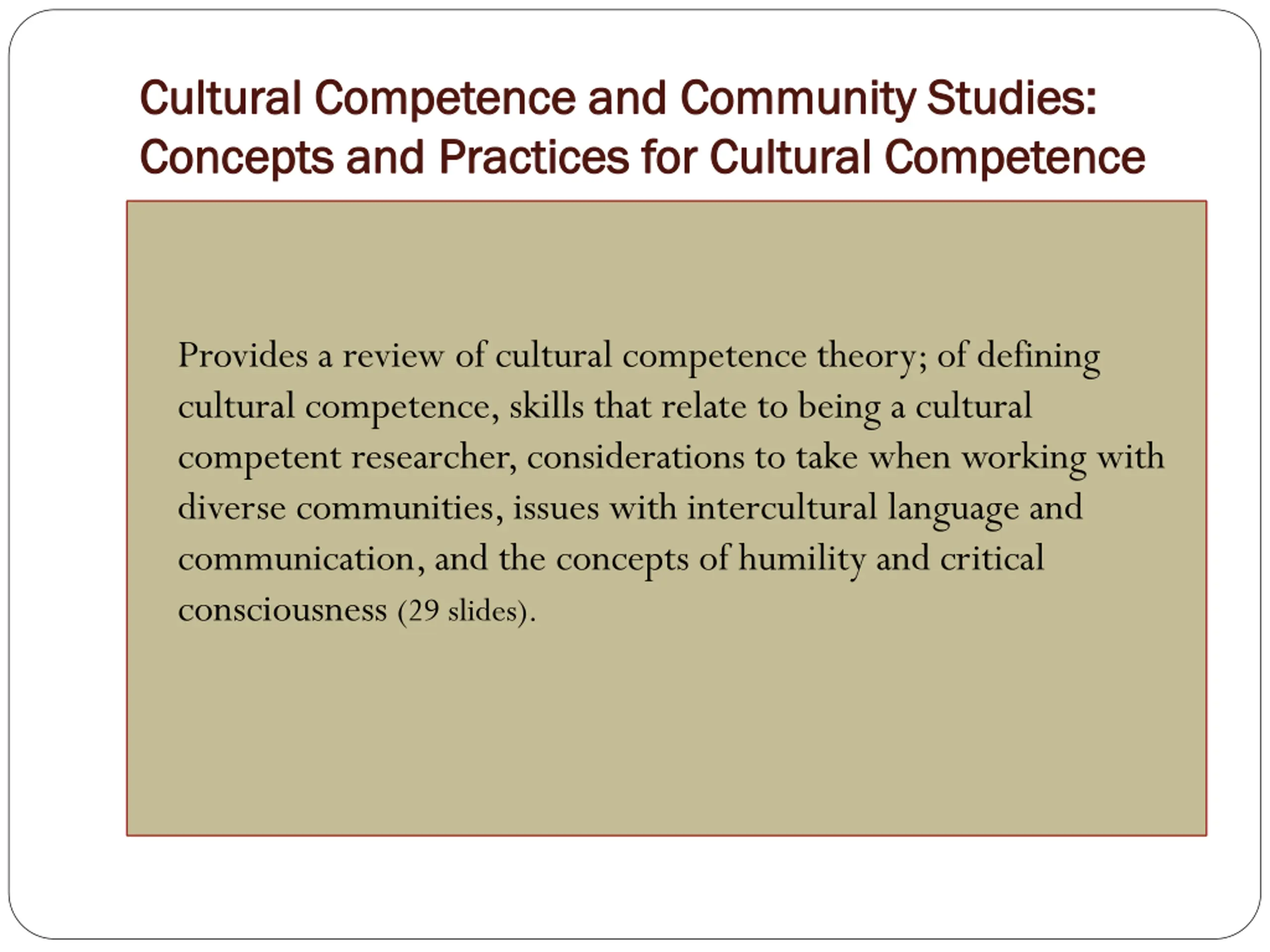 Cultural Competence and Community Studies: Cultural Competence and Community Studies: Concepts and Practices for Cultural Competence Concepts and Practices for Cultural Competence Provides a review of cultural competence theory; of defining cultural competence, skills that relate to being a cultural competent researcher, considerations to take when working with diverse communities, issues with intercultural language and communication, and the concepts of humility and critical consciousness (29 slides).