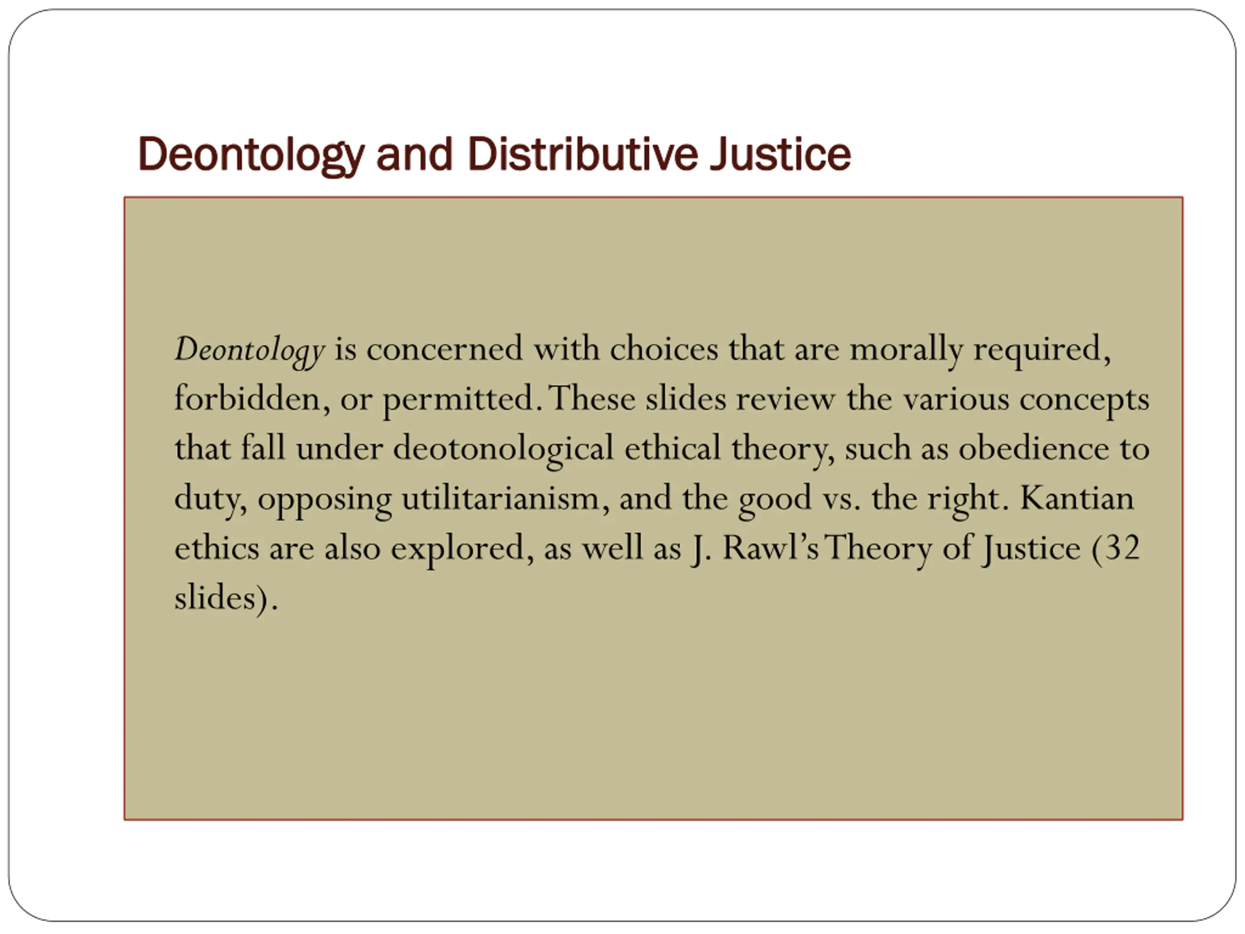Deontology Deontology and Distributive and Distributive Justice Justice Deontology is concerned with choices that are morally required, forbidden, or permitted. These slides review the various concepts that fall under deotonological ethical theory, such as obedience to duty, opposing utilitarianism, and the good vs. the right. Kantian ethics are also explored, as well as J. Rawl sTheory of Justice (32 slides).