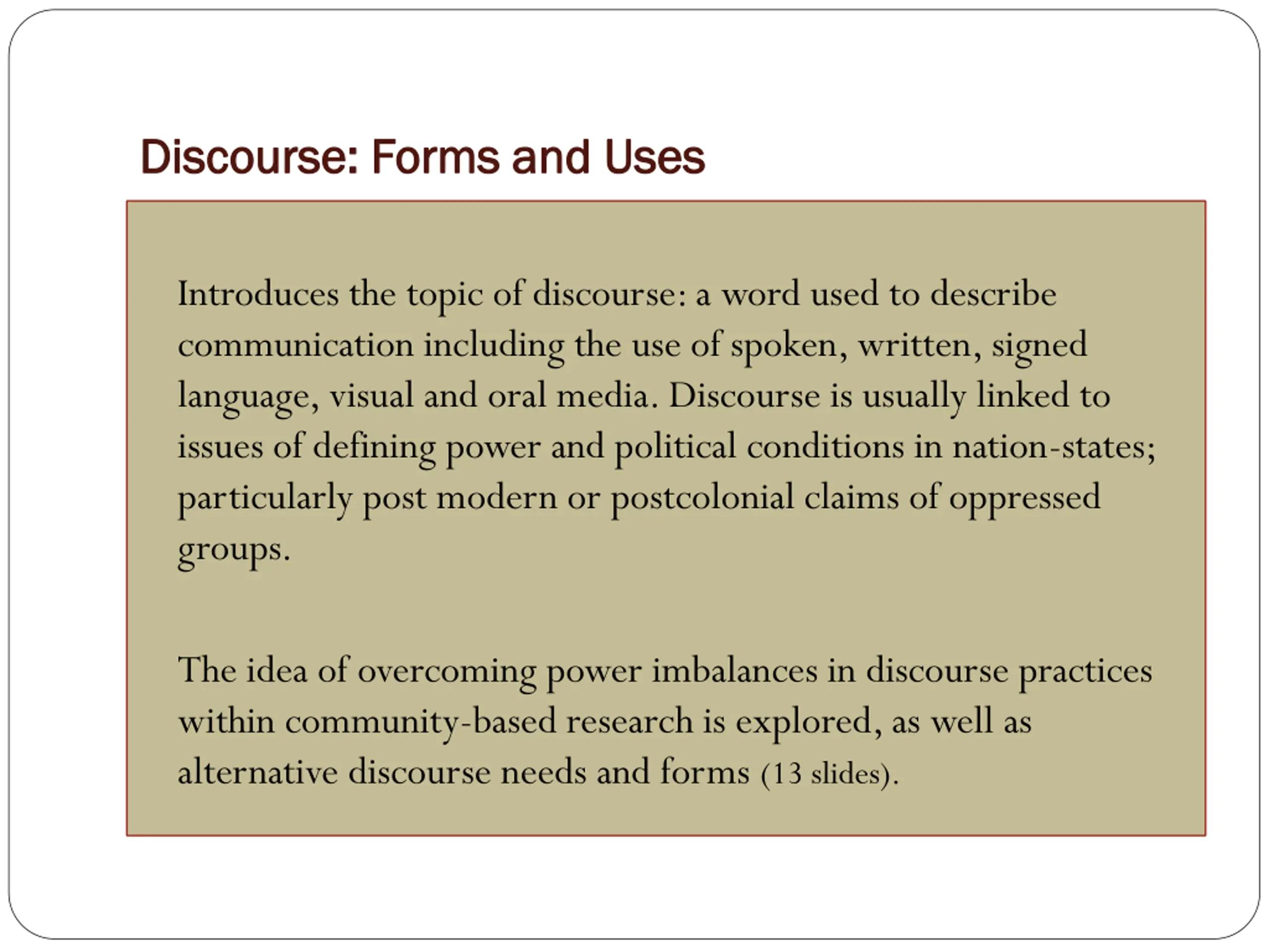 Discourse: Forms and Uses Discourse: Forms and Uses Introduces the topic of discourse: a word used to describe communication including the use of spoken, written, signed language, visual and oral media. Discourse is usually linked to issues of defining power and political conditions in nation-states; particularly post modern or postcolonial claims of oppressed groups. The idea of overcoming power imbalances in discourse practices within community-based research is explored, as well as alternative discourse needs and forms (13 slides).