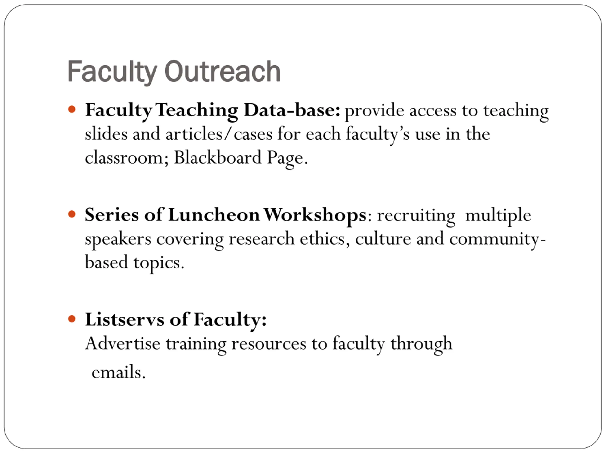 Faculty Outreach Faculty Outreach Faculty Teaching Data-base: provide access to teaching slides and articles/cases for each faculty s use in the classroom; Blackboard Page. Series of Luncheon Workshops: recruiting multiple speakers covering research ethics, culture and community- based topics. Listservs of Faculty: Advertise training resources to faculty through emails.