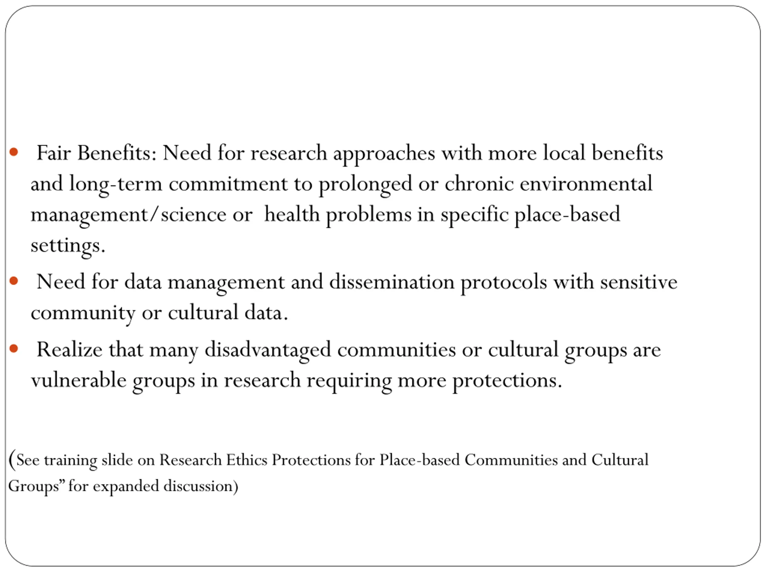 Fair Benefits: Need for research approaches with more local benefits and long-term commitment to prolonged or chronic environmental management/science or health problems in specific place-based settings. Need for data management and dissemination protocols with sensitive community or cultural data. Realize that many disadvantaged communities or cultural groups are vulnerable groups in research requiring more protections. (See training slide on Research Ethics Protections for Place-based Communities and Cultural Groups for expanded discussion)