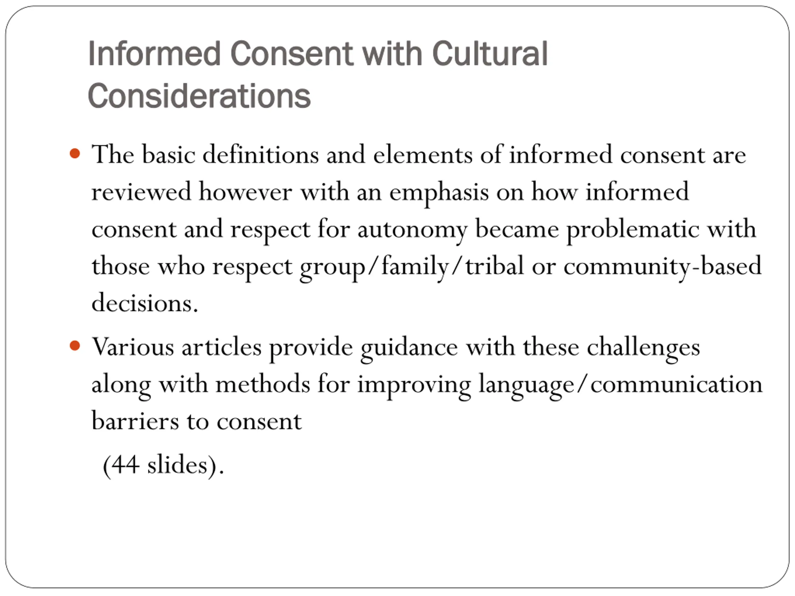 Informed Consent with Cultural Informed Consent with Cultural Considerations Considerations The basic definitions and elements of informed consent are reviewed however with an emphasis on how informed consent and respect for autonomy became problematic with those who respect group/family/tribal or community-based decisions. Various articles provide guidance with these challenges along with methods for improving language/communication barriers to consent (44 slides).