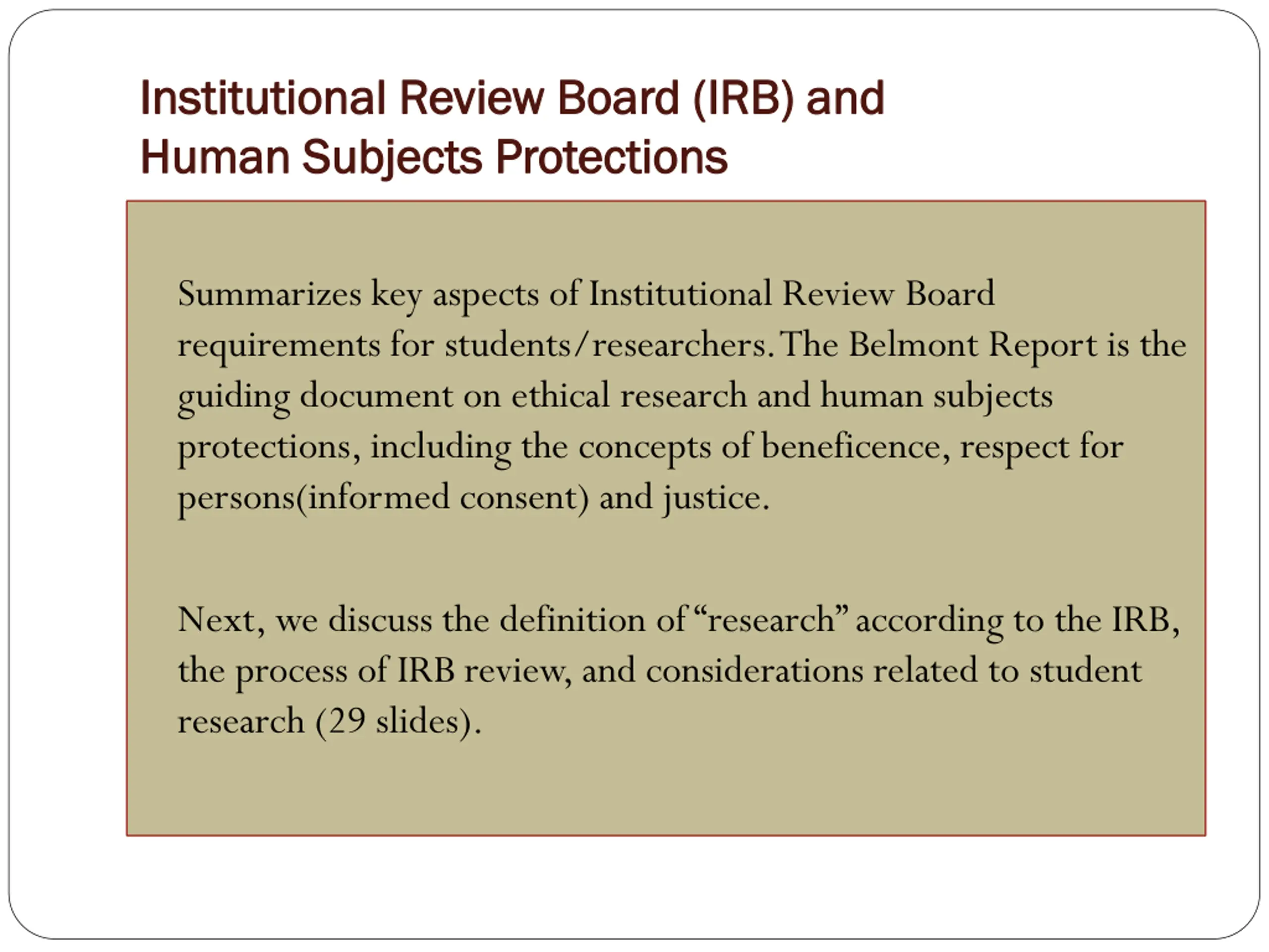 Institutional Review Board (IRB) and Institutional Review Board (IRB) and Human Subjects Protections Human Subjects Protections Summarizes key aspects of Institutional Review Board requirements for students/researchers. The Belmont Report is the guiding document on ethical research and human subjects protections, including the concepts of beneficence, respect for persons(informed consent) and justice. Next, we discuss the definition of research according to the IRB, the process of IRB review, and considerations related to student research (29 slides).