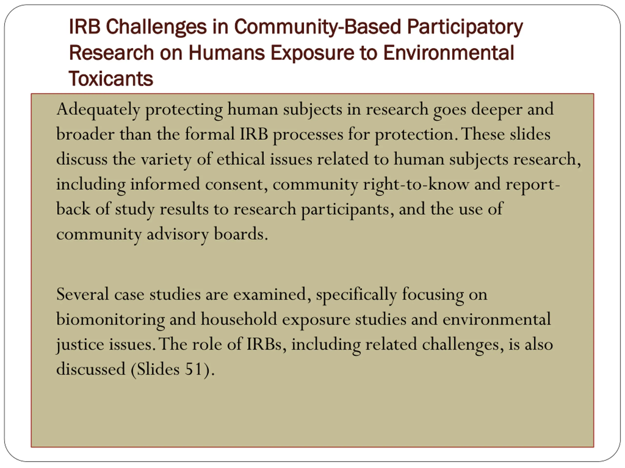 IRB Challenges in Community IRB Challenges in Community- -Based Participatory Research on Humans Exposure to Environmental Research on Humans Exposure to Environmental Toxicants Toxicants Adequately protecting human subjects in research goes deeper and broader than the formal IRB processes for protection. These slides discuss the variety of ethical issues related to human subjects research, including informed consent, community right-to-know and report- back of study results to research participants, and the use of community advisory boards. Based Participatory Several case studies are examined, specifically focusing on biomonitoring and household exposure studies and environmental justice issues. The role of IRBs, including related challenges, is also discussed (Slides 51).