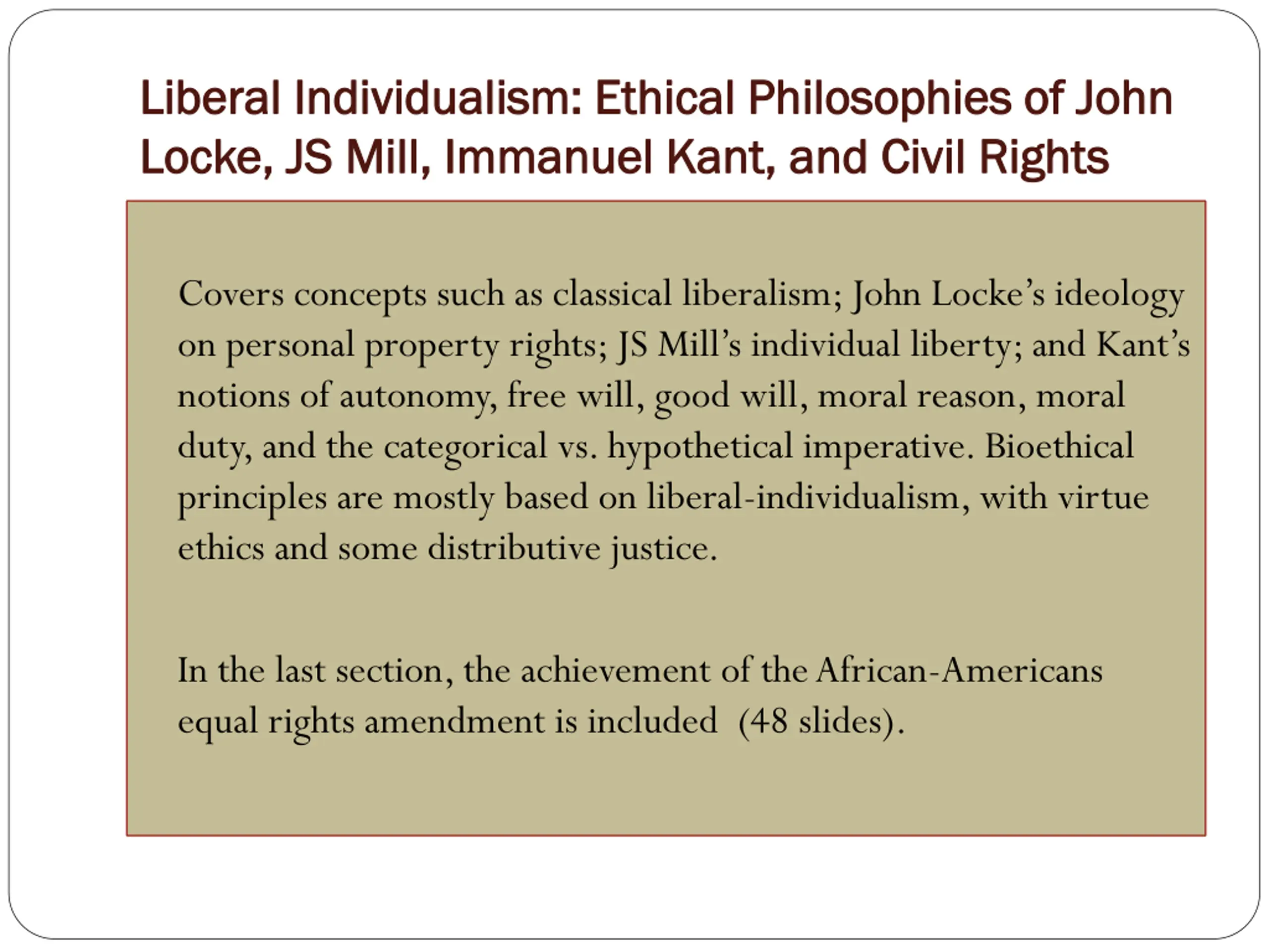 Liberal Liberal Individualism: Ethical Philosophies of John Individualism: Ethical Philosophies of John Locke, JS Mill, Immanuel Kant, and Civil Rights Locke, JS Mill, Immanuel Kant, and Civil Rights Covers concepts such as classical liberalism; John Locke s ideology on personal property rights; JS Mill s individual liberty; and Kant s notions of autonomy, free will, good will, moral reason, moral duty, and the categorical vs. hypothetical imperative. Bioethical principles are mostly based on liberal-individualism, with virtue ethics and some distributive justice. In the last section, the achievement of the African-Americans equal rights amendment is included (48 slides).