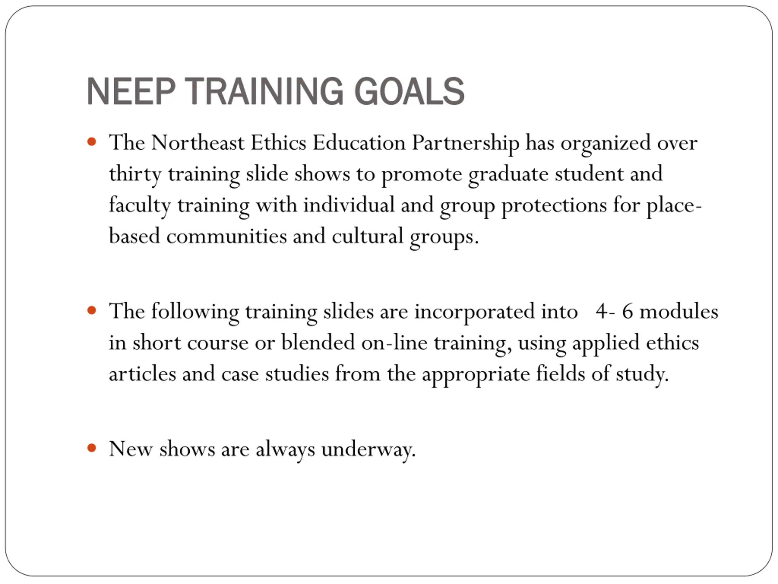 NEEP TRAINING GOALS NEEP TRAINING GOALS The Northeast Ethics Education Partnership has organized over thirty training slide shows to promote graduate student and faculty training with individual and group protections for place- based communities and cultural groups. The following training slides are incorporated into 4- 6 modules in short course or blended on-line training, using applied ethics articles and case studies from the appropriate fields of study. New shows are always underway.
