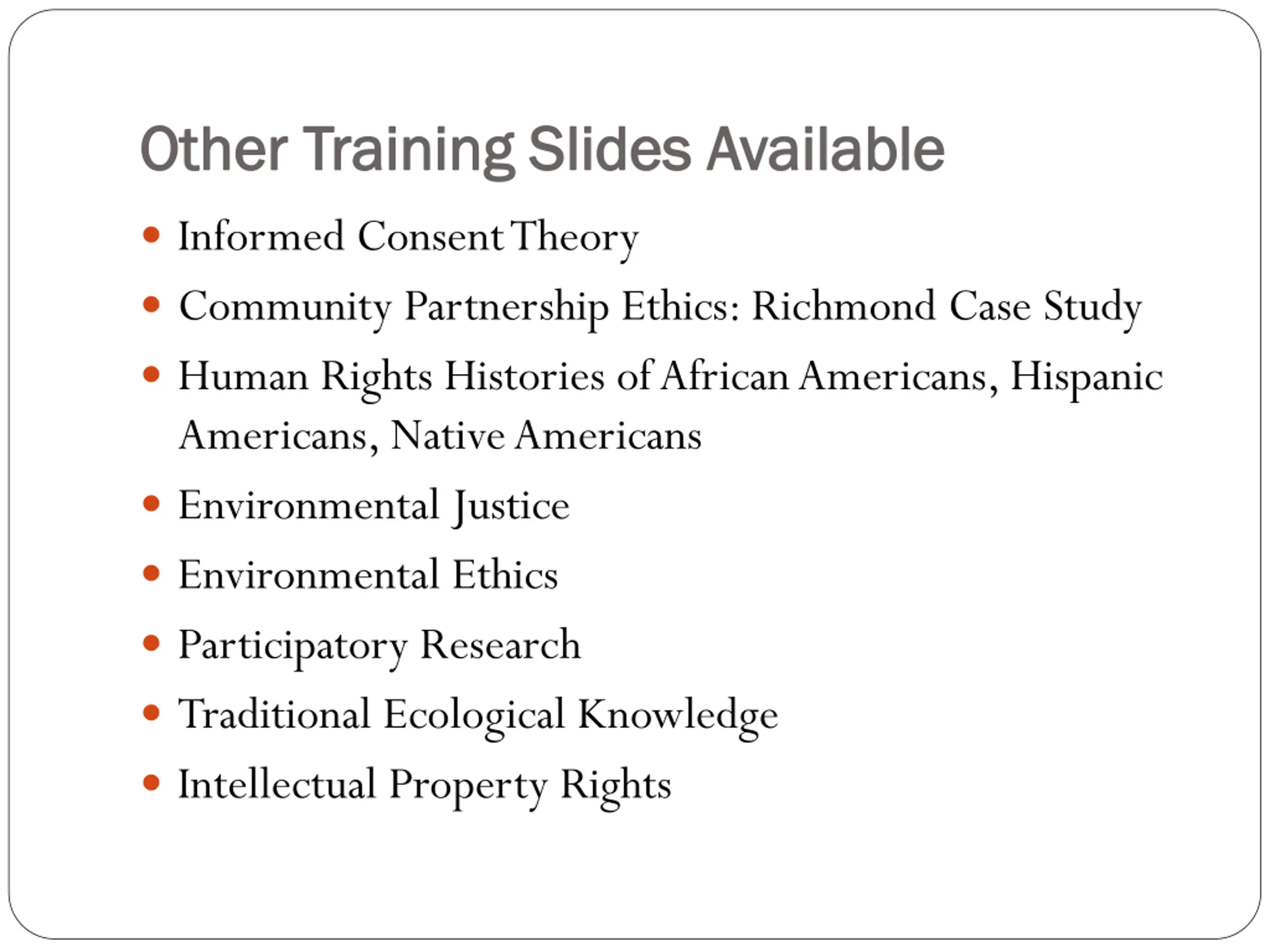 Other Training Slides Available Other Training Slides Available Informed Consent Theory Community Partnership Ethics: Richmond Case Study Human Rights Histories of African Americans, Hispanic Americans, Native Americans Environmental Justice Environmental Ethics Participatory Research Traditional Ecological Knowledge Intellectual Property Rights