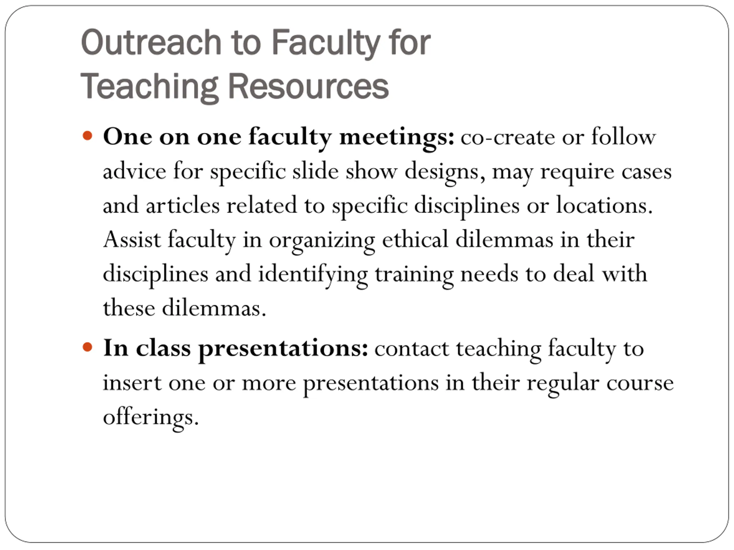 Outreach to Faculty for Outreach to Faculty for Teaching Resources Teaching Resources One on one faculty meetings: co-create or follow advice for specific slide show designs, may require cases and articles related to specific disciplines or locations. Assist faculty in organizing ethical dilemmas in their disciplines and identifying training needs to deal with these dilemmas. In class presentations: contact teaching faculty to insert one or more presentations in their regular course offerings.
