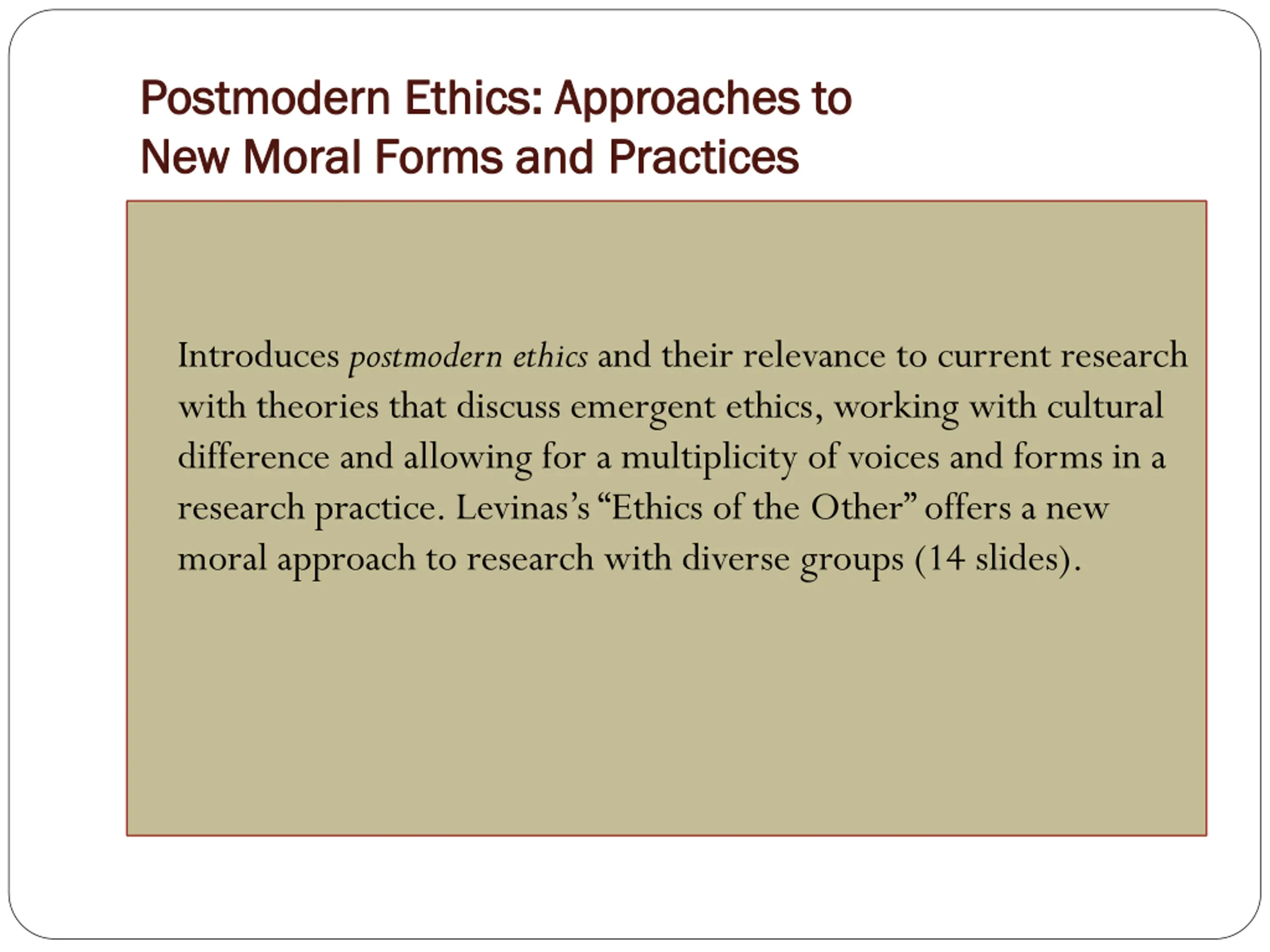 Postmodern Postmodern Ethics: Approaches to Ethics: Approaches to New New Moral Forms and Moral Forms and Practices Practices Introduces postmodern ethics and their relevance to current research with theories that discuss emergent ethics, working with cultural difference and allowing for a multiplicity of voices and forms in a research practice. Levinas s Ethics of the Other offers a new moral approach to research with diverse groups (14 slides).
