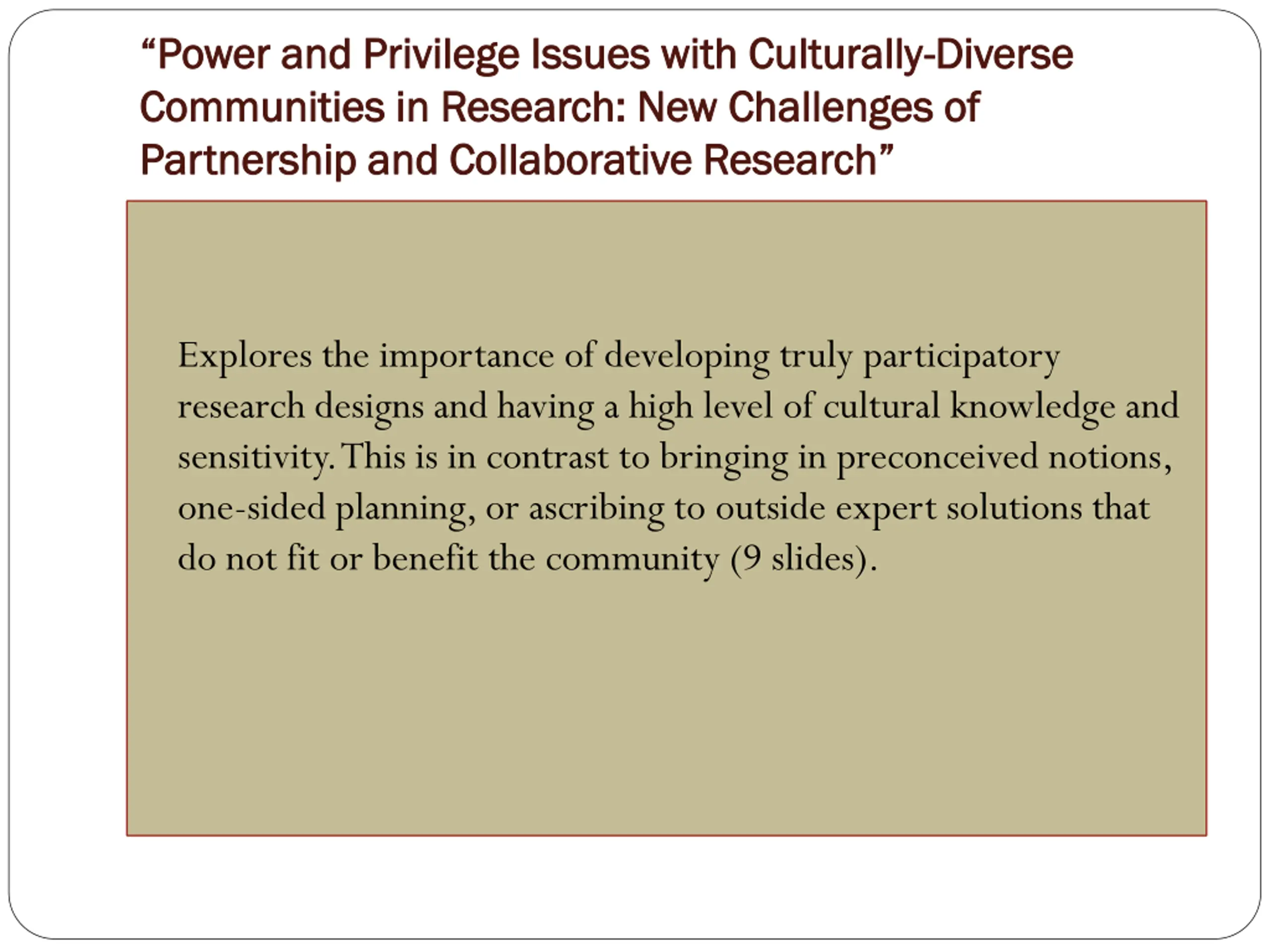 Power and Privilege Issues with Culturally Power and Privilege Issues with Culturally- -Diverse Communities in Research: New Challenges of Communities in Research: New Challenges of Partnership and Collaborative Research Partnership and Collaborative Research Diverse Explores the importance of developing truly participatory research designs and having a high level of cultural knowledge and sensitivity. This is in contrast to bringing in preconceived notions, one-sided planning, or ascribing to outside expert solutions that do not fit or benefit the community (9 slides).