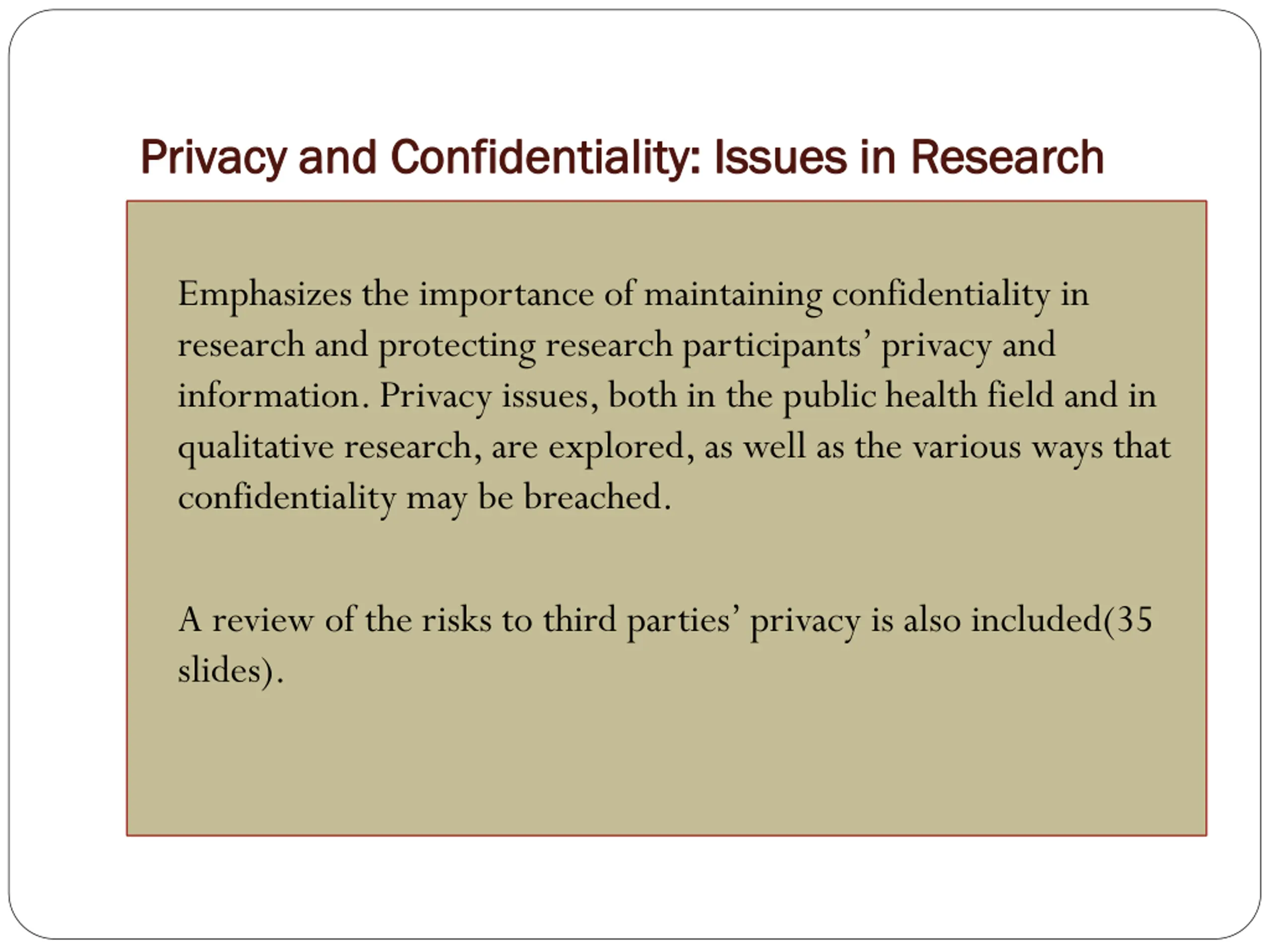Privacy and Confidentiality: Issues in Research Privacy and Confidentiality: Issues in Research Emphasizes the importance of maintaining confidentiality in research and protecting research participants privacy and information. Privacy issues, both in the public health field and in qualitative research, are explored, as well as the various ways that confidentiality may be breached. A review of the risks to third parties privacy is also included(35 slides).