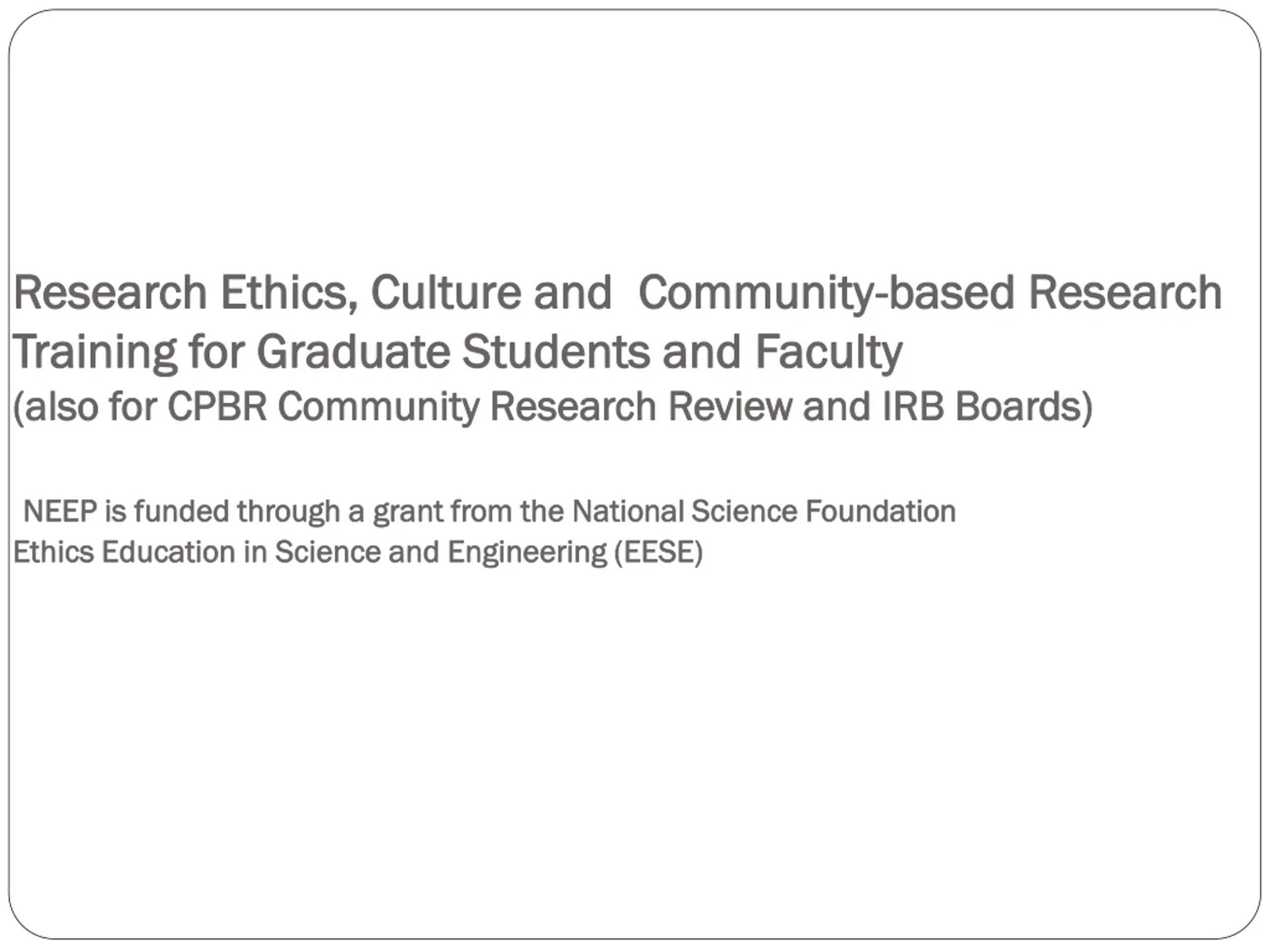 Research Ethics, Culture and Community Research Ethics, Culture and Community- -based Research Training for Graduate Students and Faculty Training for Graduate Students and Faculty (also for CPBR Community Research Review and IRB Boards) (also for CPBR Community Research Review and IRB Boards) based Research NEEP is funded through a grant from the National Science Foundation NEEP is funded through a grant from the National Science Foundation Ethics Education in Science and Engineering (EESE) Ethics Education in Science and Engineering (EESE)