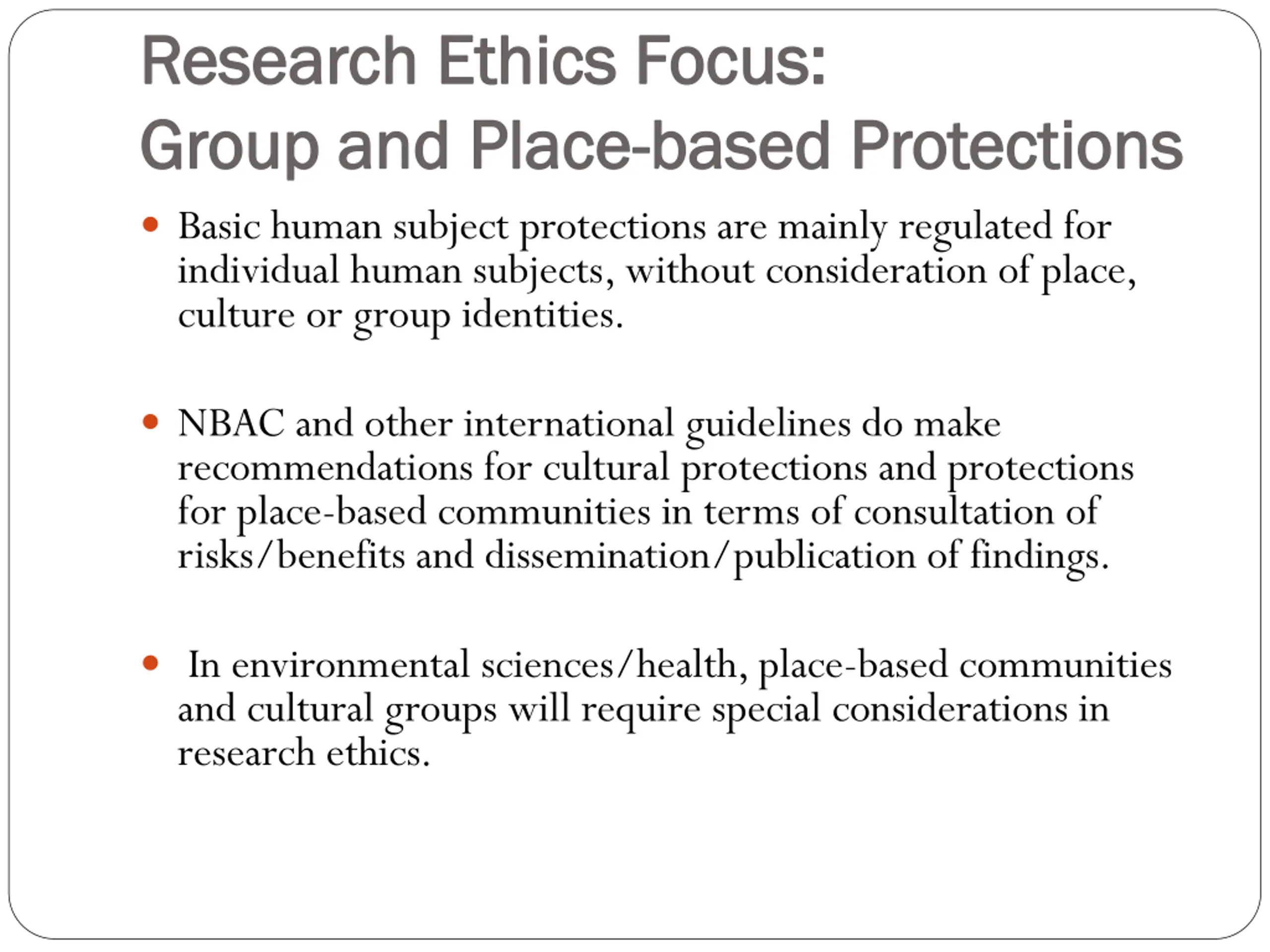 Research Ethics Focus: Research Ethics Focus: Group and Place Group and Place- -based Protections based Protections Basic human subject protections are mainly regulated for individual human subjects, without consideration of place, culture or group identities. NBAC and other international guidelines do make recommendations for cultural protections and protections for place-based communities in terms of consultation of risks/benefits and dissemination/publication of findings. In environmental sciences/health, place-based communities and cultural groups will require special considerations in research ethics.