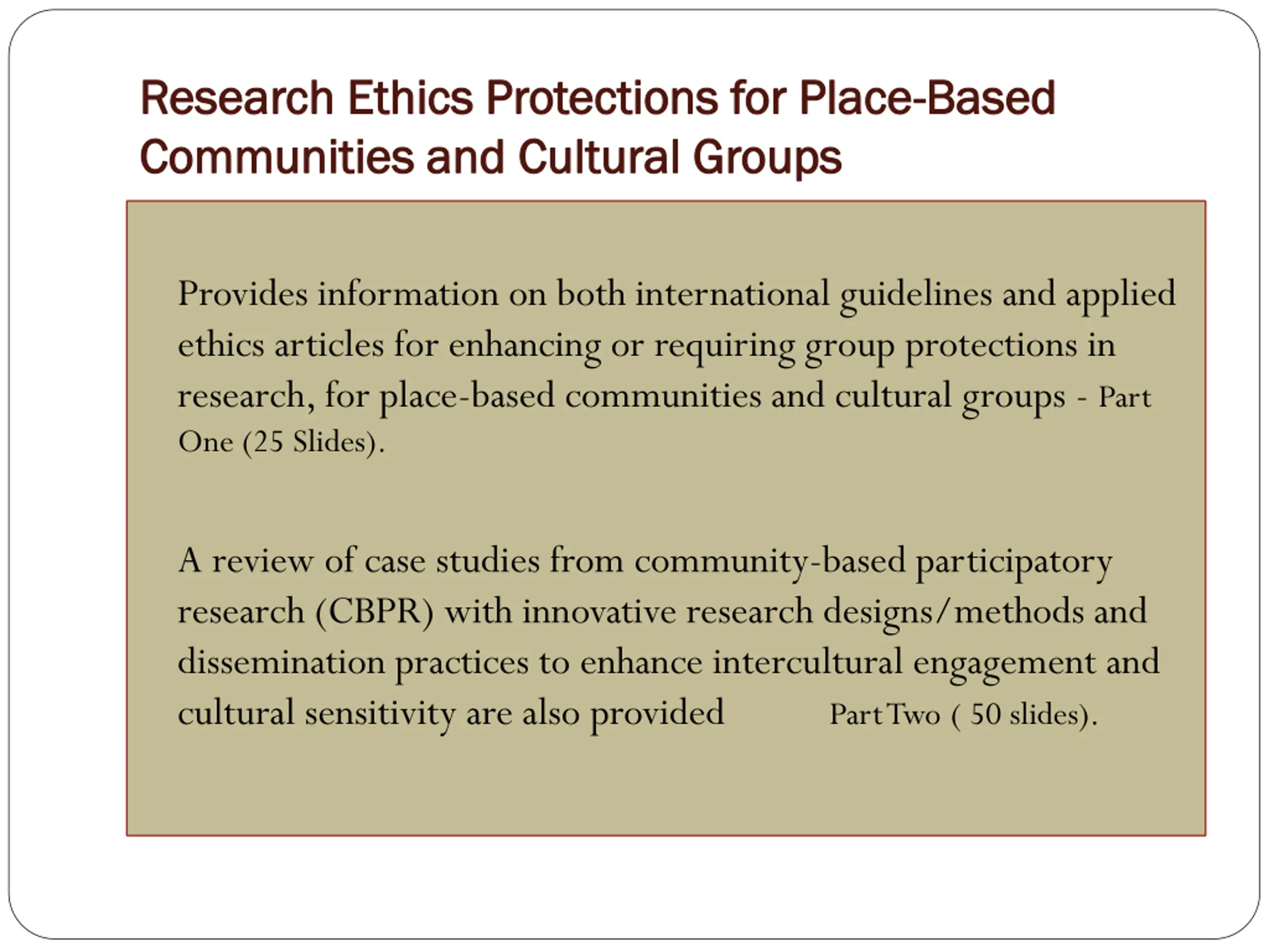 Research Ethics Protections for Place Research Ethics Protections for Place- -Based Communities and Cultural Groups Communities and Cultural Groups Based Provides information on both international guidelines and applied ethics articles for enhancing or requiring group protections in research, for place-based communities and cultural groups - Part One (25 Slides). A review of case studies from community-based participatory research (CBPR) with innovative research designs/methods and dissemination practices to enhance intercultural engagement and cultural sensitivity are also provided Part Two ( 50 slides).
