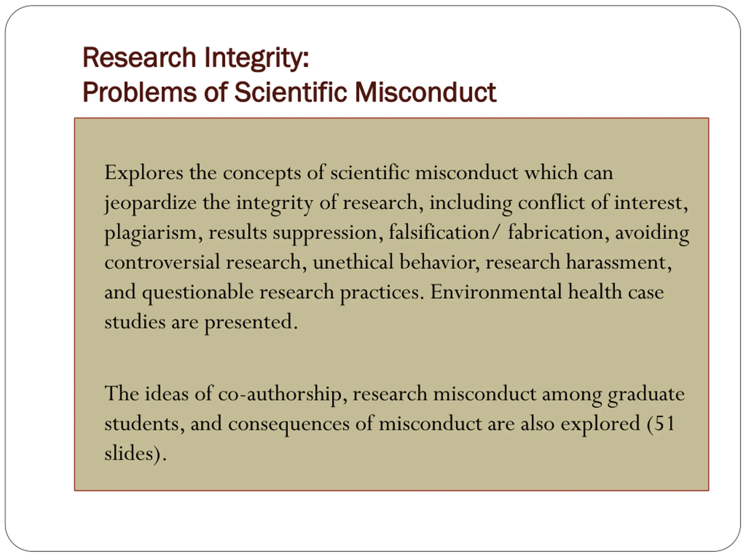Research Integrity: Research Integrity: Problems of Scientific Misconduct Problems of Scientific Misconduct Explores the concepts of scientific misconduct which can jeopardize the integrity of research, including conflict of interest, plagiarism, results suppression, falsification/ fabrication, avoiding controversial research, unethical behavior, research harassment, and questionable research practices. Environmental health case studies are presented. The ideas of co-authorship, research misconduct among graduate students, and consequences of misconduct are also explored (51 slides).