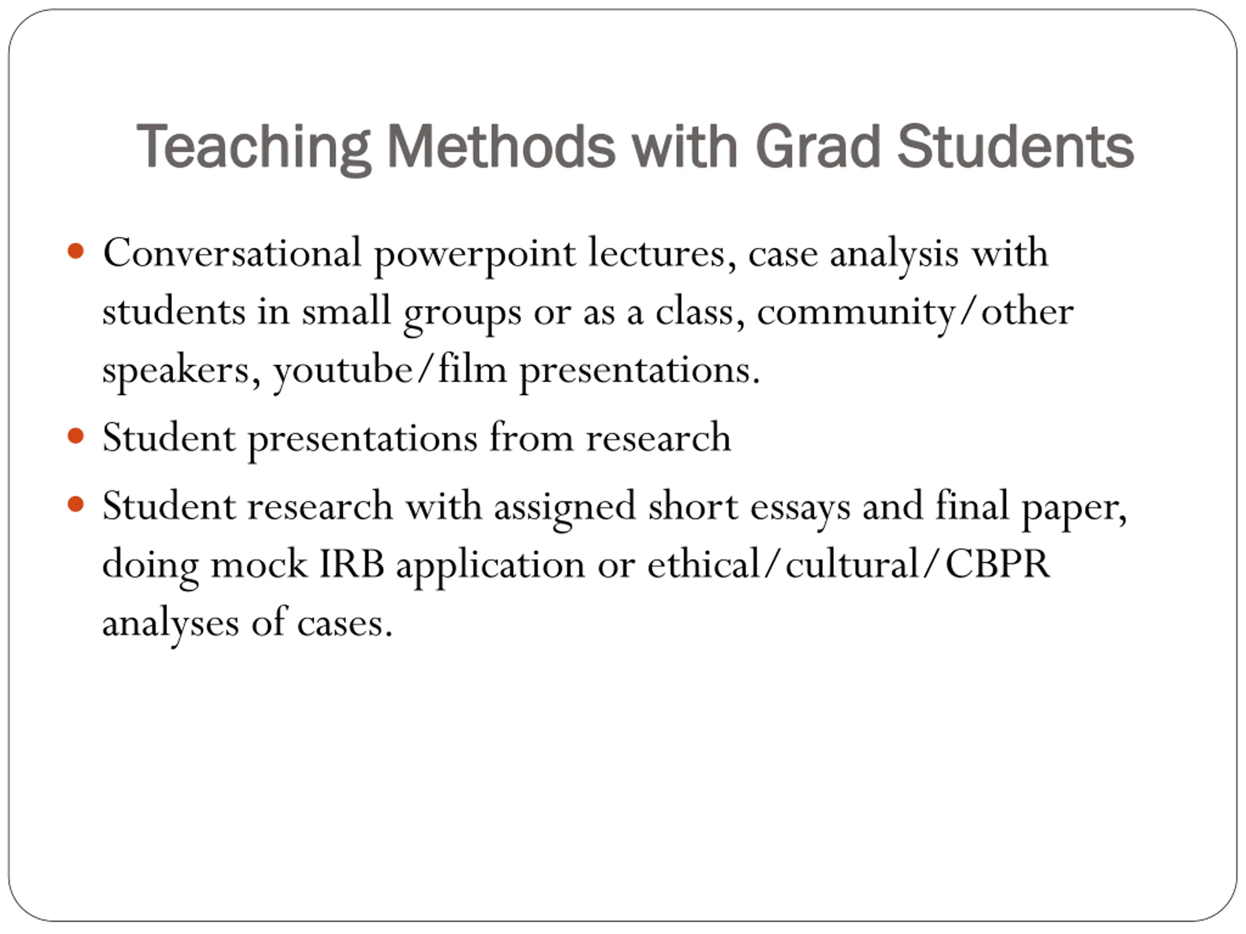 Teaching Methods with Grad Students Teaching Methods with Grad Students Conversational powerpoint lectures, case analysis with students in small groups or as a class, community/other speakers, youtube/film presentations. Student presentations from research Student research with assigned short essays and final paper, doing mock IRB application or ethical/cultural/CBPR analyses of cases.