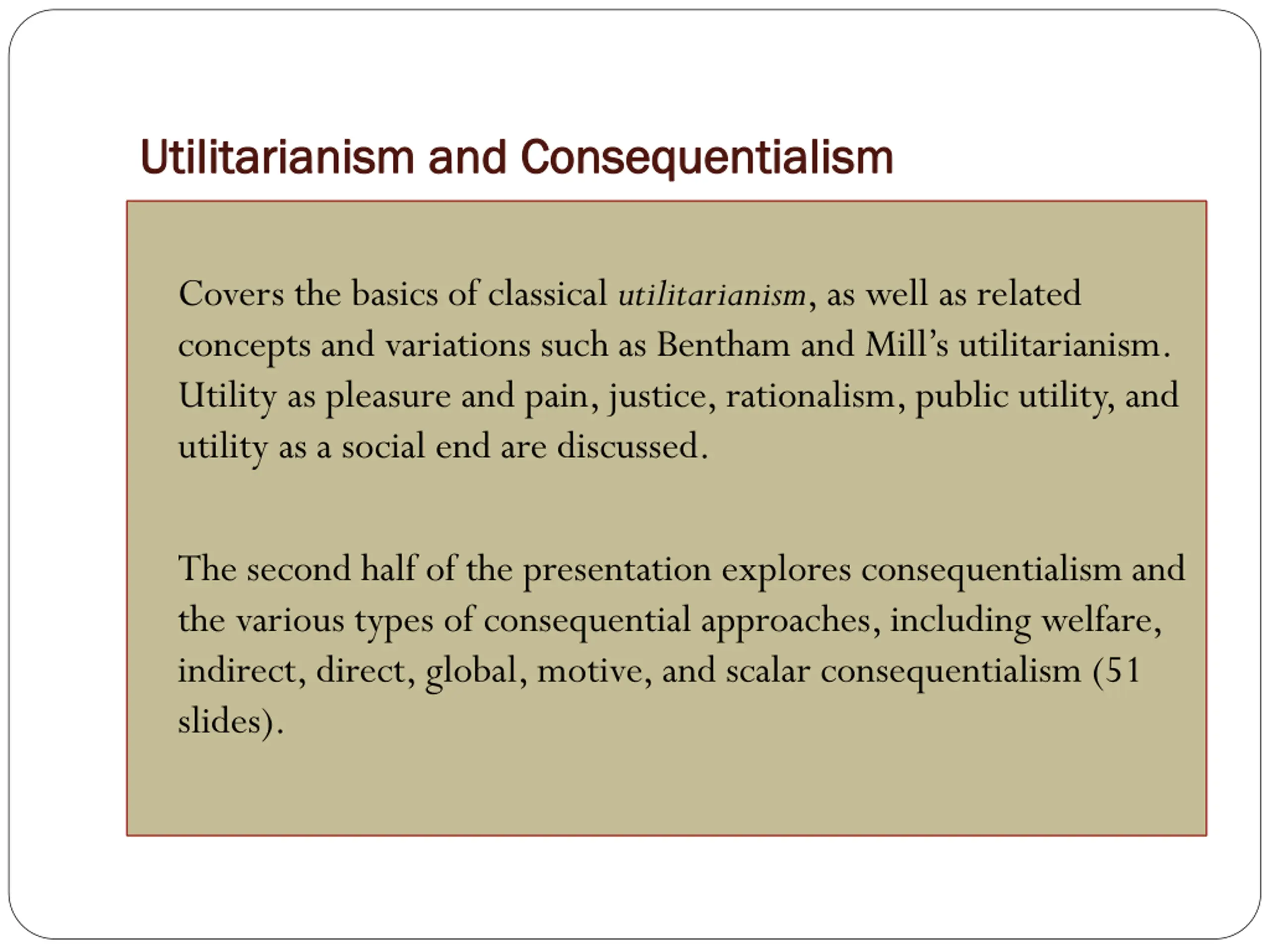 Utilitarianism Utilitarianism and and Consequentialism Consequentialism Covers the basics of classical utilitarianism, as well as related concepts and variations such as Bentham and Mill s utilitarianism. Utility as pleasure and pain, justice, rationalism, public utility, and utility as a social end are discussed. The second half of the presentation explores consequentialism and the various types of consequential approaches, including welfare, indirect, direct, global, motive, and scalar consequentialism (51 slides).