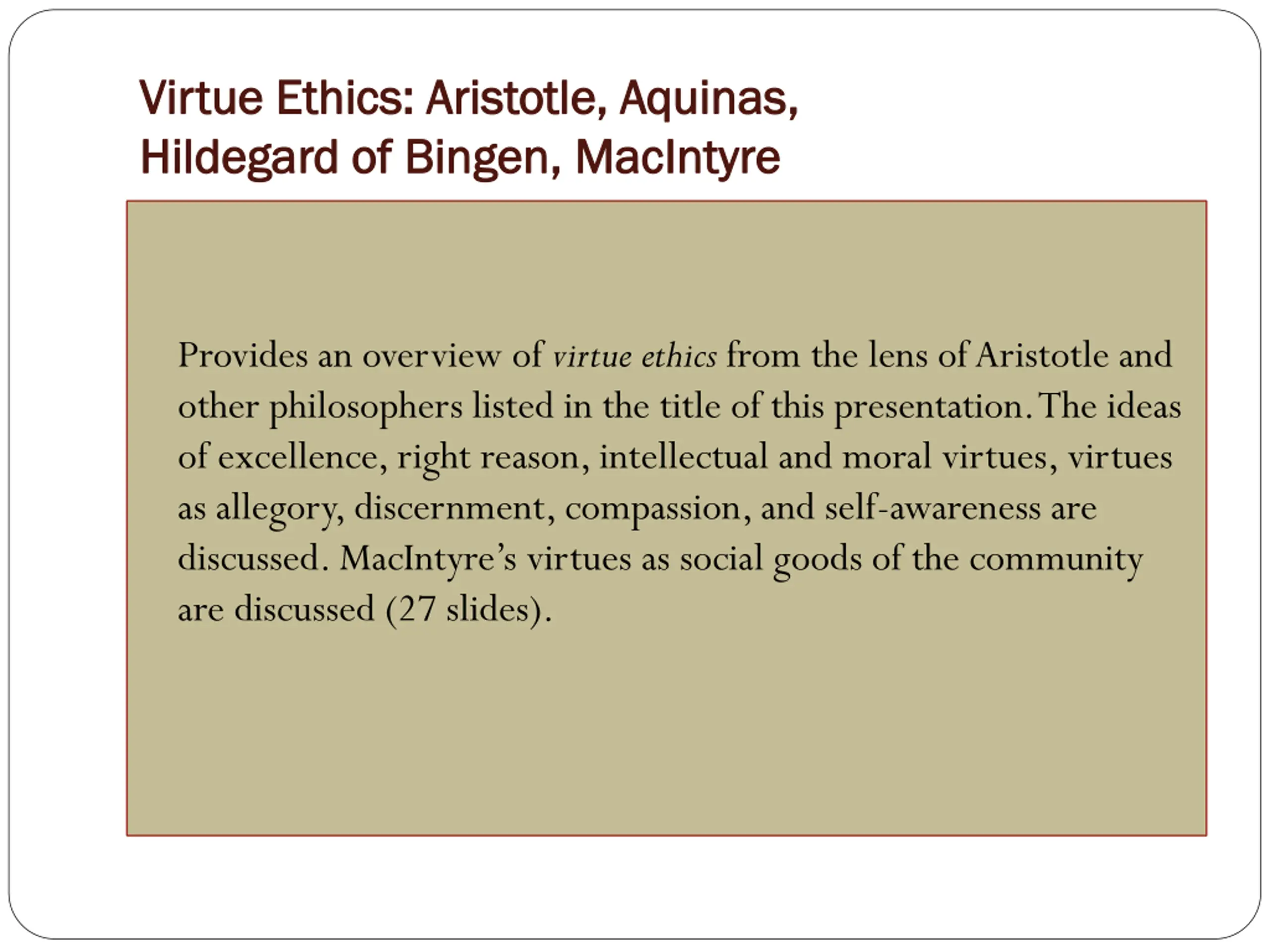 Virtue Virtue Ethics: Aristotle, Aquinas Ethics: Aristotle, Aquinas, Hildegard of Hildegard of Bingen Bingen, , MacIntyre MacIntyre , Provides an overview of virtue ethics from the lens of Aristotle and other philosophers listed in the title of this presentation. The ideas of excellence, right reason, intellectual and moral virtues, virtues as allegory, discernment, compassion, and self-awareness are discussed. MacIntyre s virtues as social goods of the community are discussed (27 slides).