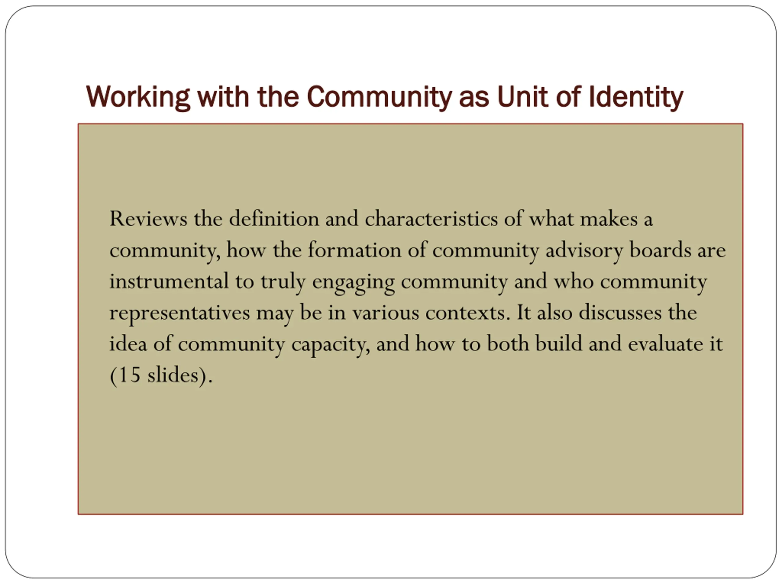 Working with the Community as Unit of Identity Working with the Community as Unit of Identity Reviews the definition and characteristics of what makes a community, how the formation of community advisory boards are instrumental to truly engaging community and who community representatives may be in various contexts. It also discusses the idea of community capacity, and how to both build and evaluate it (15 slides).