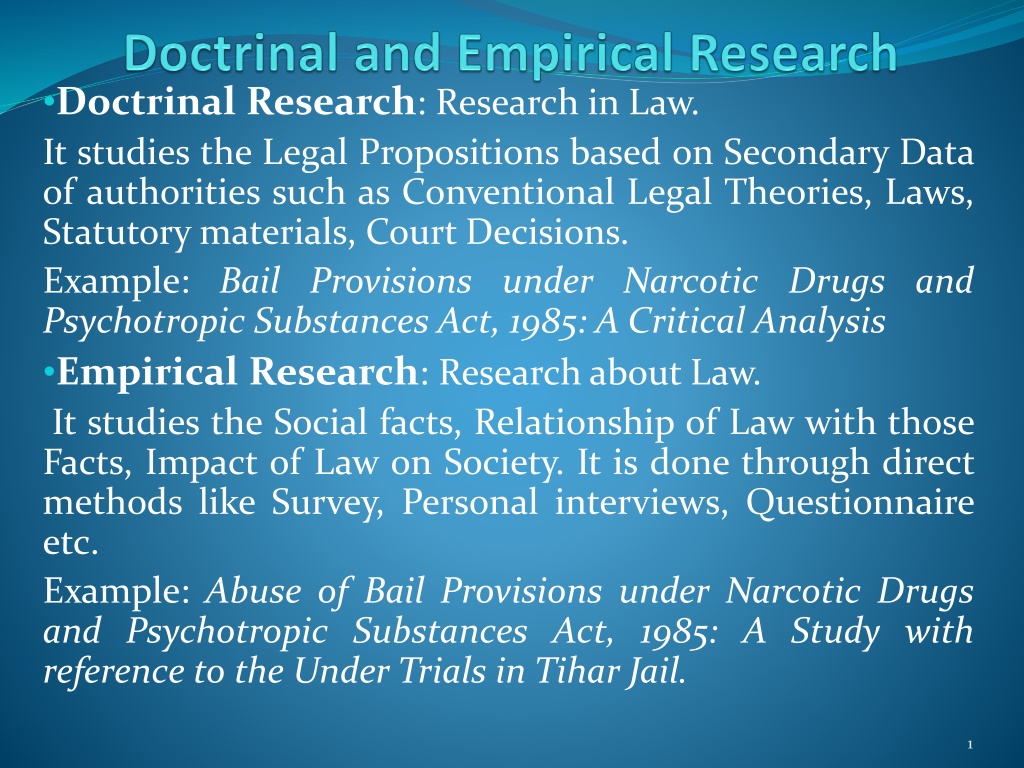 Doctrinal Research: Research in Law. It studies the Legal Propositions based on Secondary Data of authorities such as Conventional Legal Theories, Laws, Statutory materials, Court Decisions. Example: Bail Provisions under Narcotic Drugs and Psychotropic Substances Act, 1985: A Critical Analysis Empirical Research: Research about Law. It studies the Social facts, Relationship of Law with those Facts, Impact of Law on Society. It is done through direct methods like Survey, Personal interviews, Questionnaire etc. Example: Abuse of Bail Provisions under Narcotic Drugs and Psychotropic Substances Act, 1985: A Study with reference to the Under Trials in Tihar Jail. 1