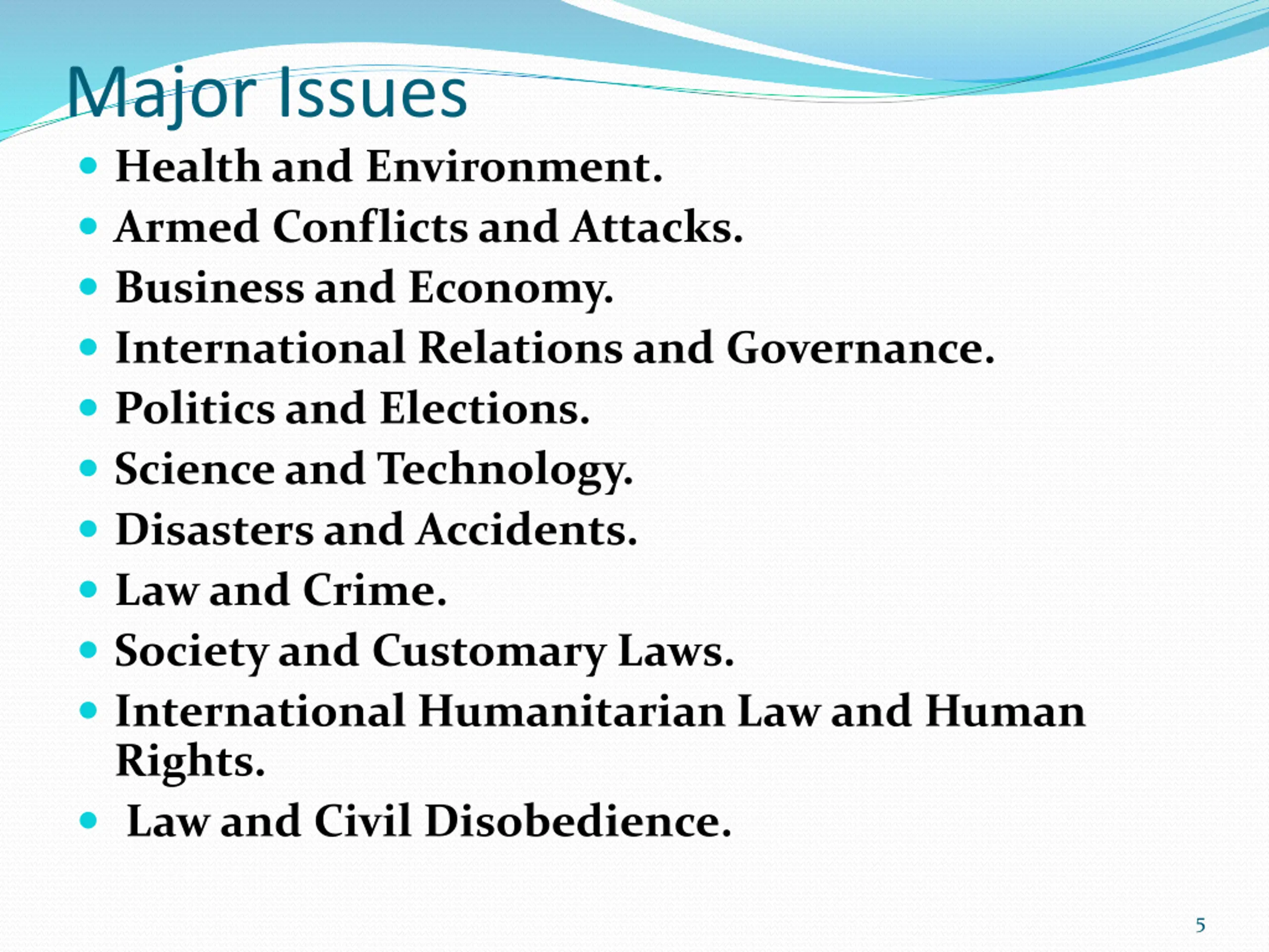 Major Issues Health and Environment. Armed Conflicts and Attacks. Business and Economy. International Relations and Governance. Politics and Elections. Science and Technology. Disasters and Accidents. Law and Crime. Society and Customary Laws. International Humanitarian Law and Human Rights. Law and Civil Disobedience. 5