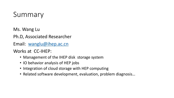 Summary Ms. Wang Lu Ph.D, Associated Researcher Email: wanglu@ihep.ac.cn Works at CC-IHEP: Management of the IHEP disk storage system IO behavior analysis of HEP jobs Integration of cloud storage with HEP computing Related software development, evaluation, problem diagnosis