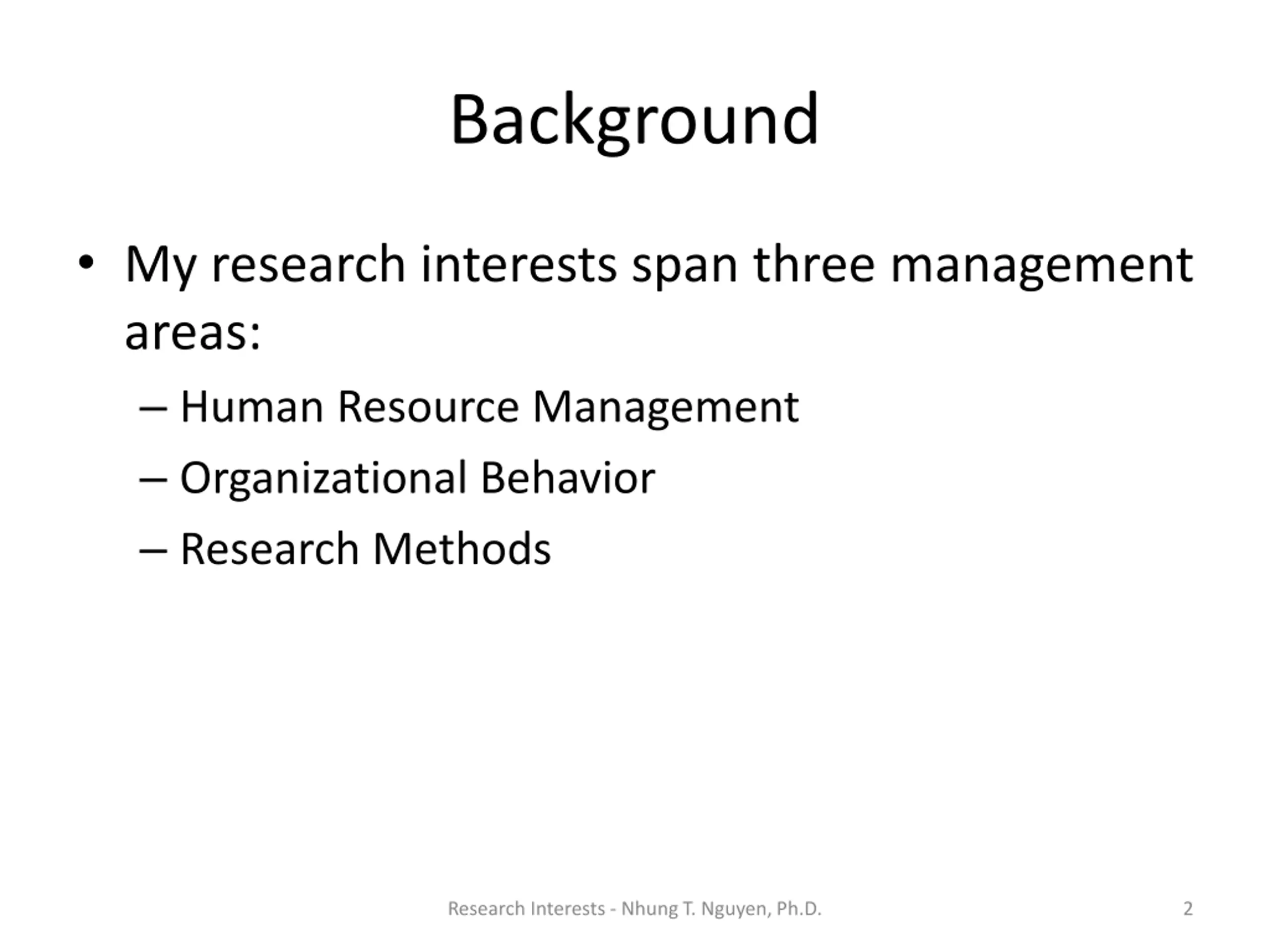 Background My research interests span three management areas: Human Resource Management Organizational Behavior Research Methods Research Interests - Nhung T. Nguyen, Ph.D. 2