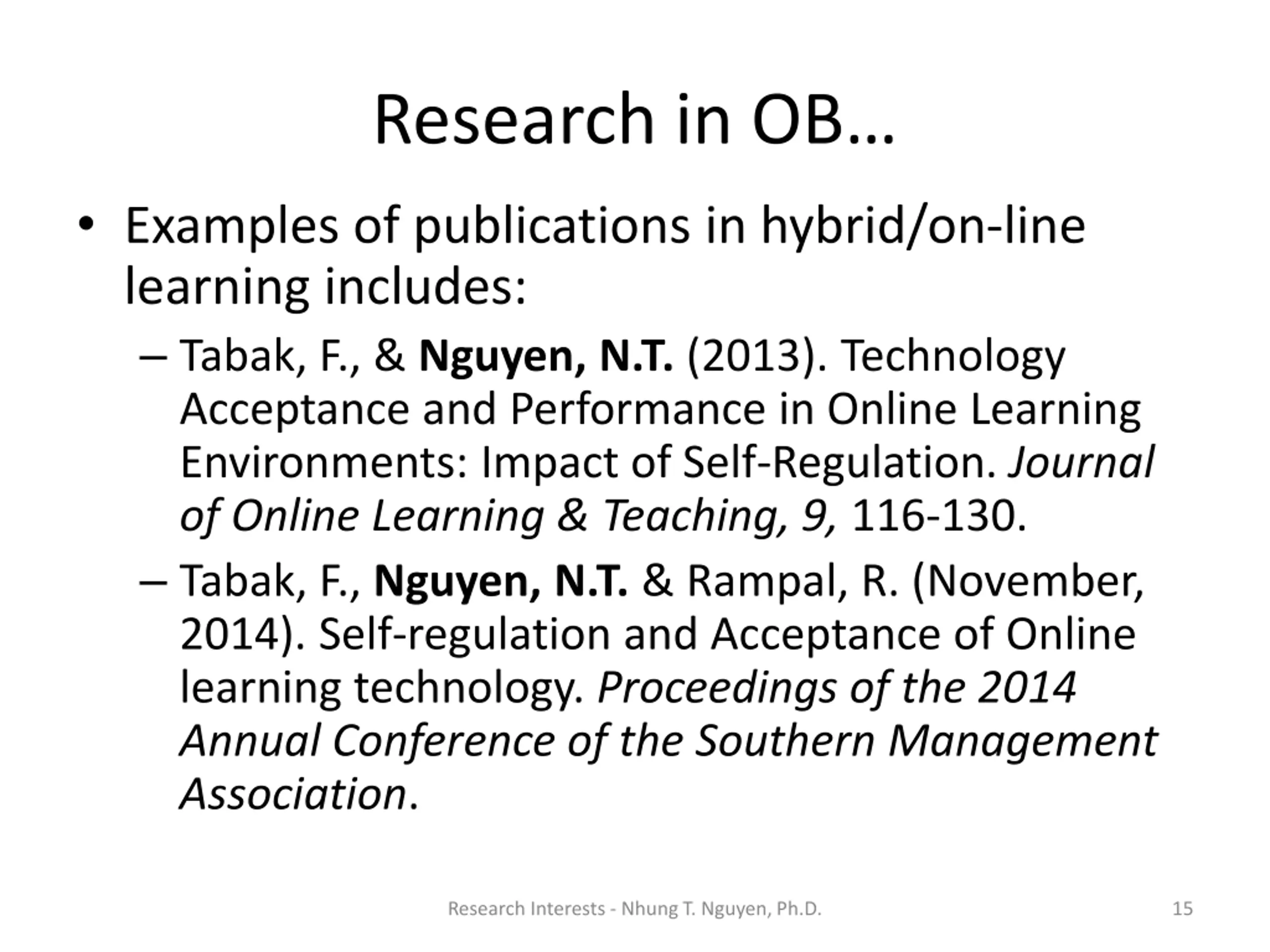 Research in OB Recently, I have expanded my research interests to include hybrid/on-line teaching. This interest originates from my teaching, which has shifted to hybrid and on-line teaching over the past 5 years. I m interested in examining how student learning is influenced by hybrid and/or on-line teaching compared to a traditional face-to-face classroom teaching. Specifically, I looked at the role of self-regulation in predicting which students will be more successful in on-line/hybrid learning vs. face-to-face learning. Research Interests - Nhung T. Nguyen, Ph.D. 14