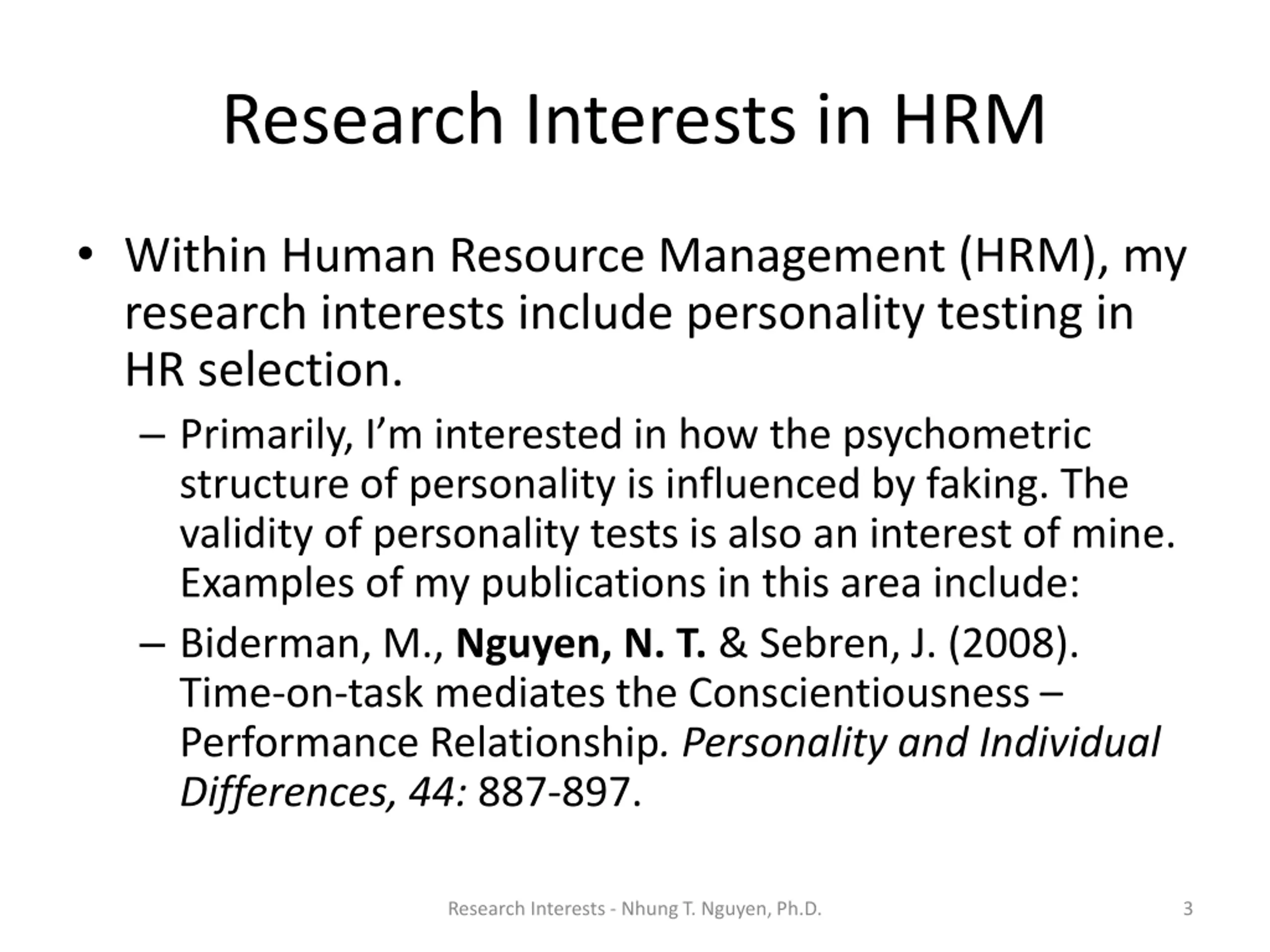 Research Interests in HRM Within Human Resource Management (HRM), my research interests include personality testing in HR selection. Primarily, I m interested in how the psychometric structure of personality is influenced by faking. The validity of personality tests is also an interest of mine. Examples of my publications in this area include: Biderman, M., Nguyen, N. T. & Sebren, J. (2008). Time-on-task mediates the Conscientiousness Performance Relationship.Personality and Individual Differences, 44: 887-897. Research Interests - Nhung T. Nguyen, Ph.D. 3