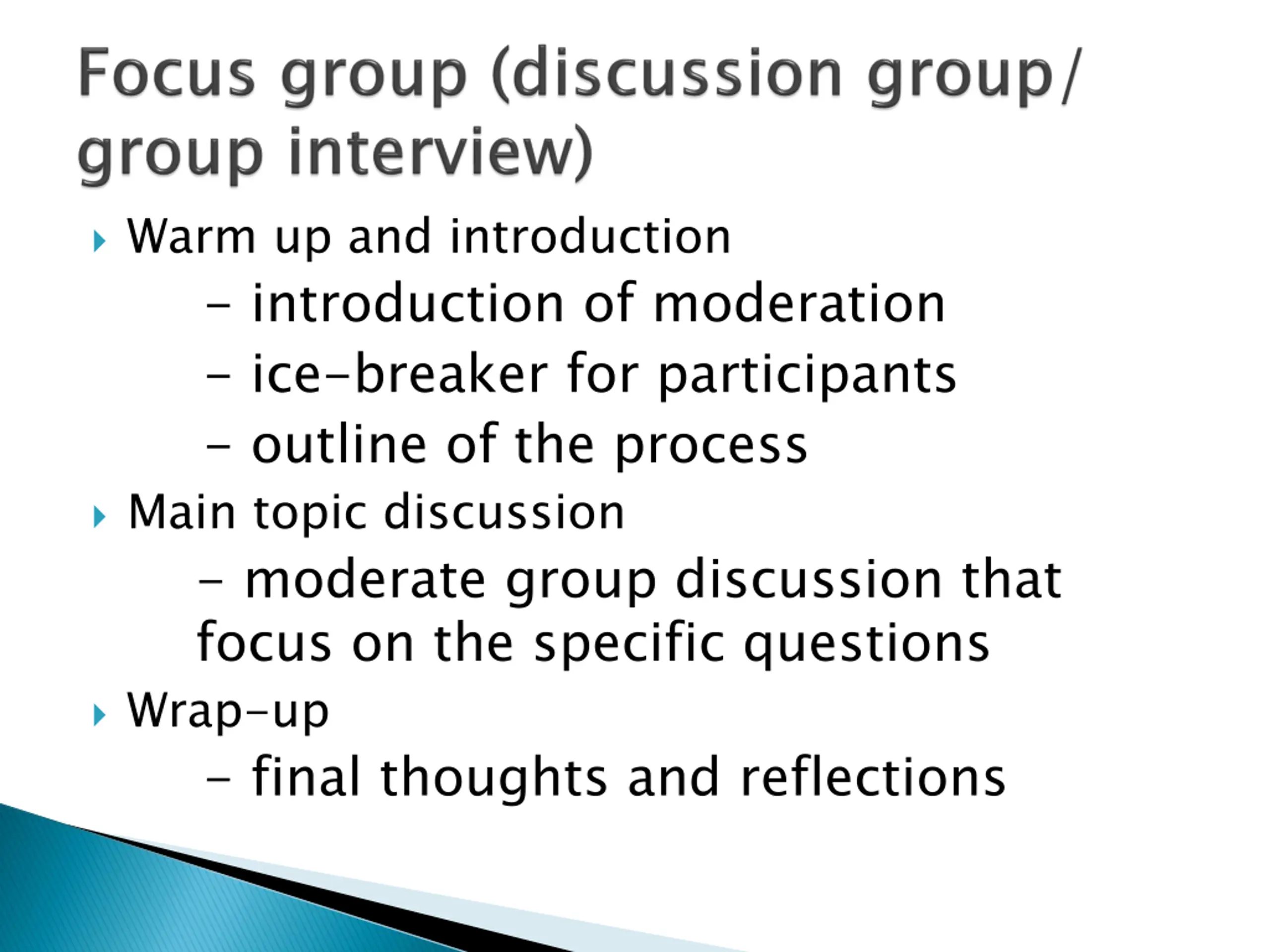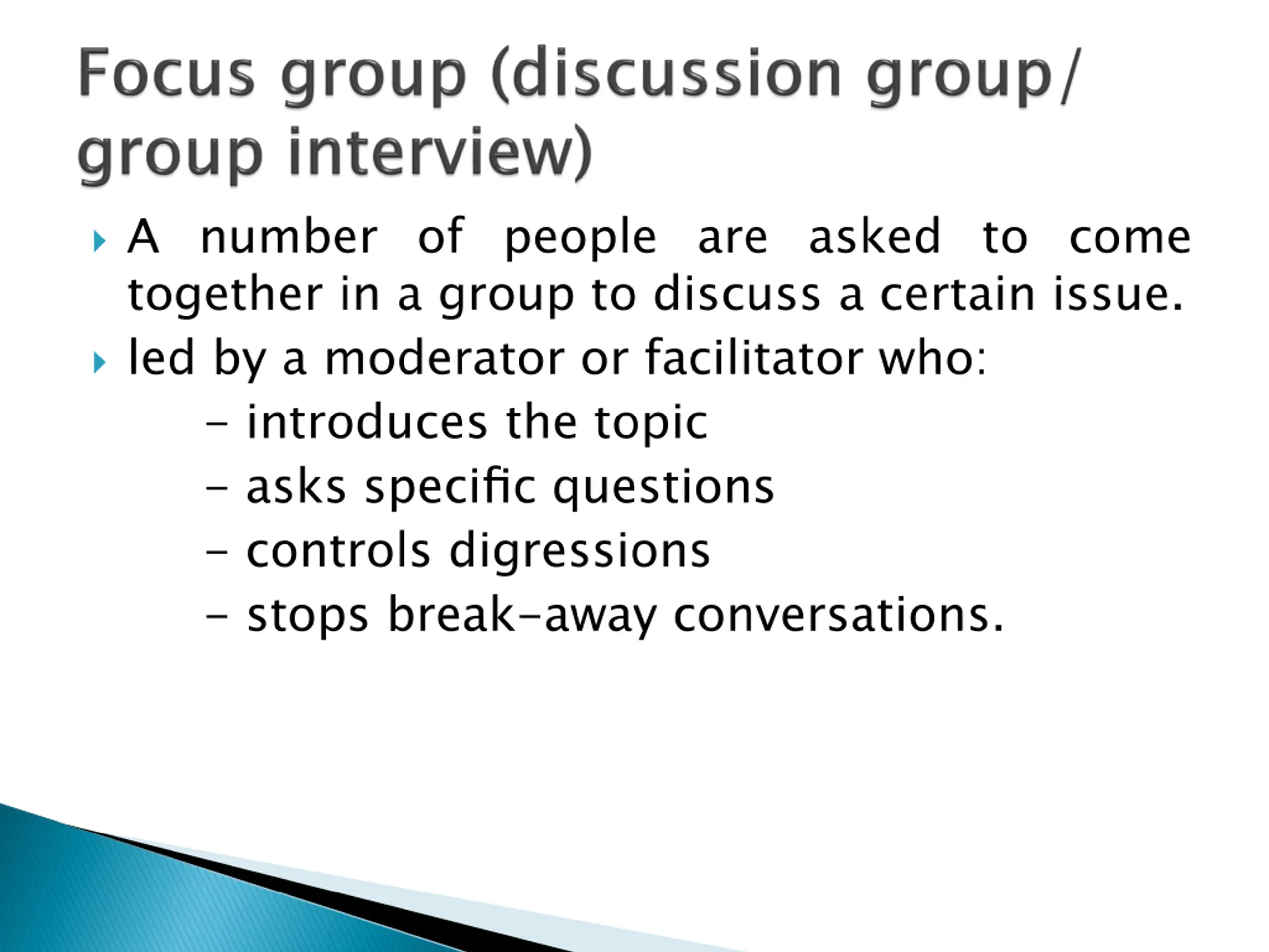 A number of people are asked to come together in a group to discuss a certain issue. led by a moderator or facilitator who: - introduces the topic - asks specific questions - controls digressions - stops break-away conversations.