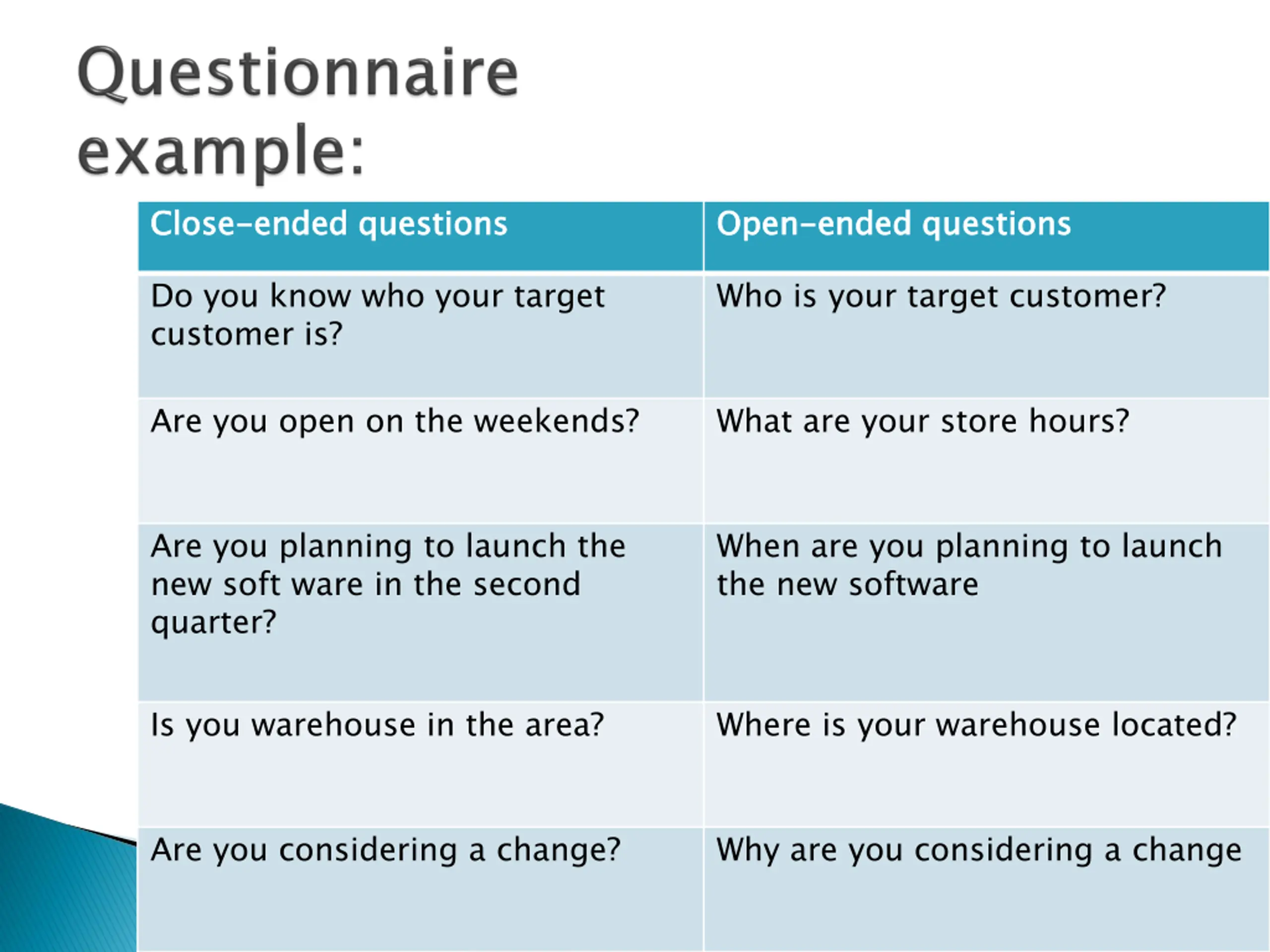 Close Close- -ended questions ended questions Open Open- -ended questions ended questions Do you know who your target customer is? Who is your target customer? Are you open on the weekends? What are your store hours? Are you planning to launch the new soft ware in the second quarter? When are you planning to launch the new software Is you warehouse in the area? Where is your warehouse located? Are you considering a change? Why are you considering a change