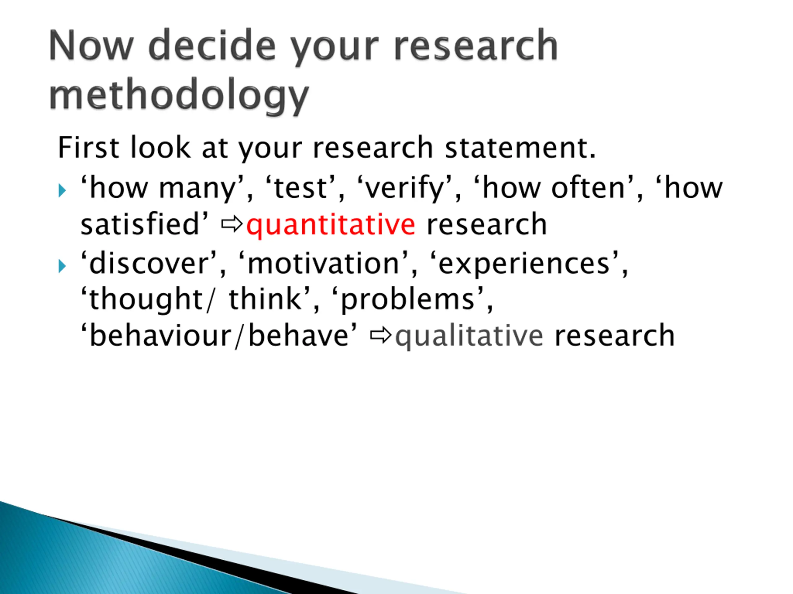 First look at your research statement. how many , test , verify , how often , how satisfied quantitative research discover , motivation , experiences , thought/ think , problems , behaviour/behave qualitative research