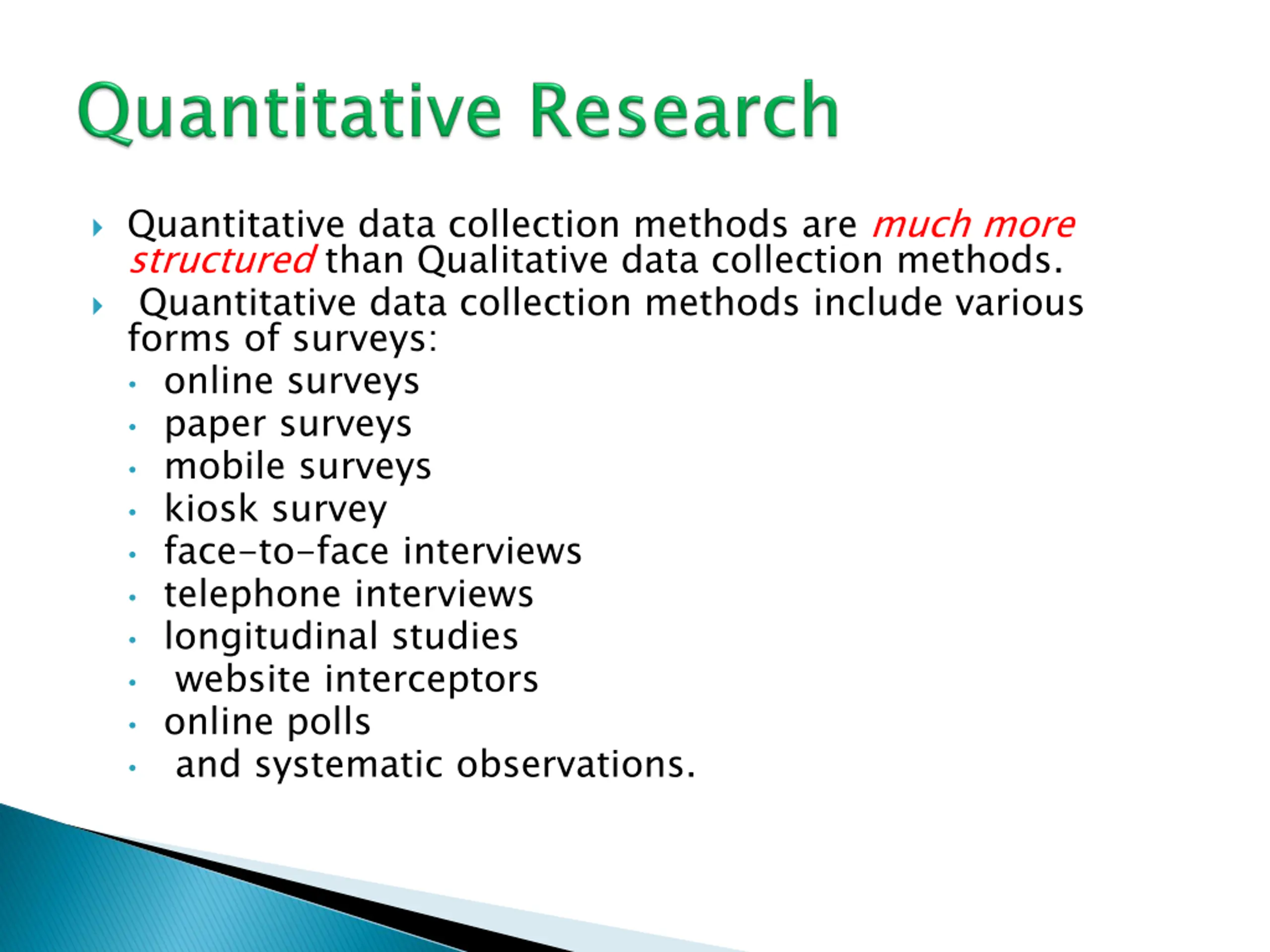 Quantitative data collection methods are much more structured than Qualitative data collection methods. Quantitative data collection methods include various forms of surveys: online surveys paper surveys mobile surveys kiosk survey face-to-face interviews telephone interviews longitudinal studies website interceptors online polls and systematic observations.
