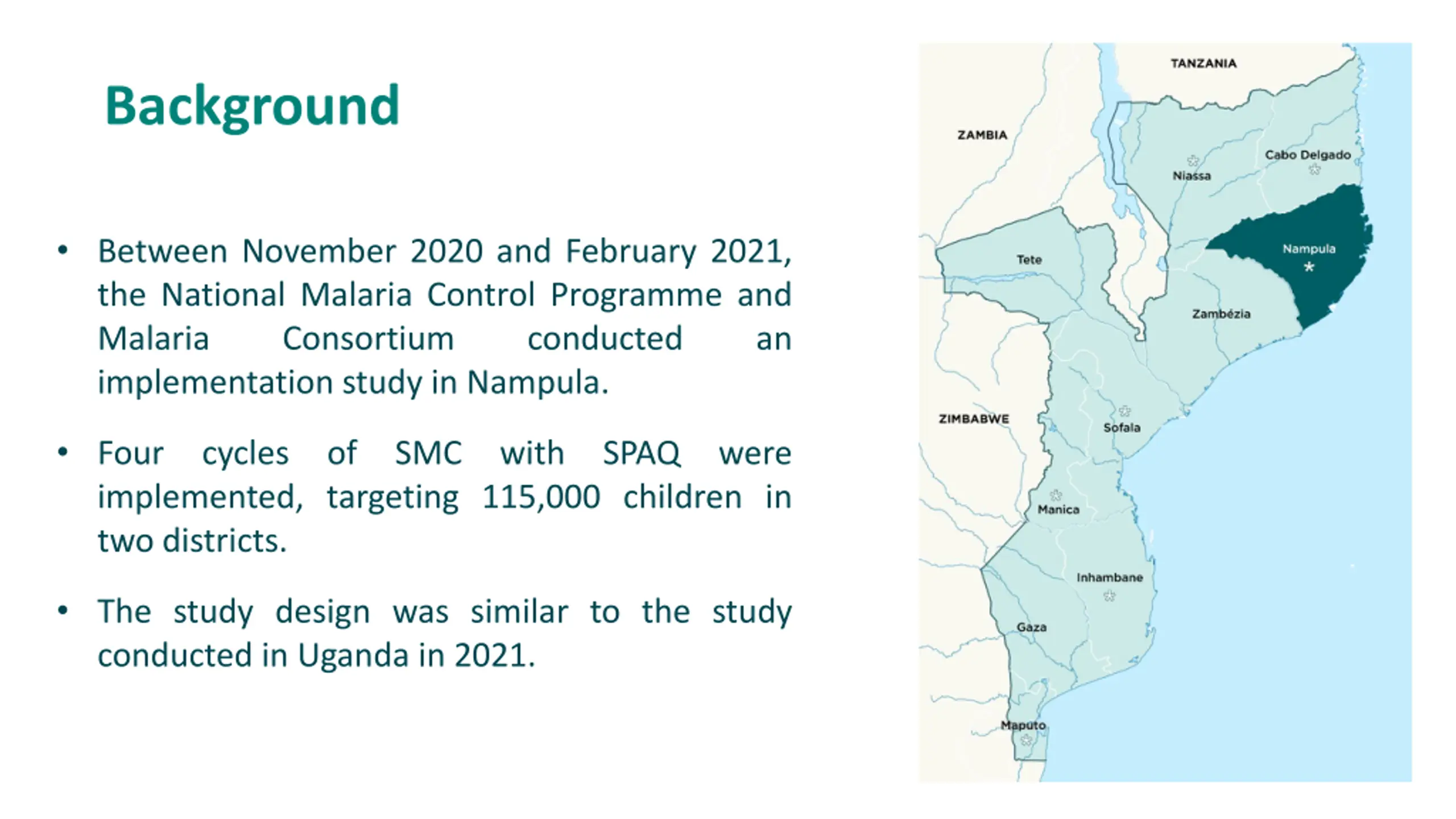 Background Between November 2020 and February 2021, the National Malaria Control Programme and Malaria Consortium implementation study in Nampula. conducted an Four implemented, targeting 115,000 children in two districts. cycles of SMC with SPAQ were The study design was similar to the study conducted in Uganda in 2021.