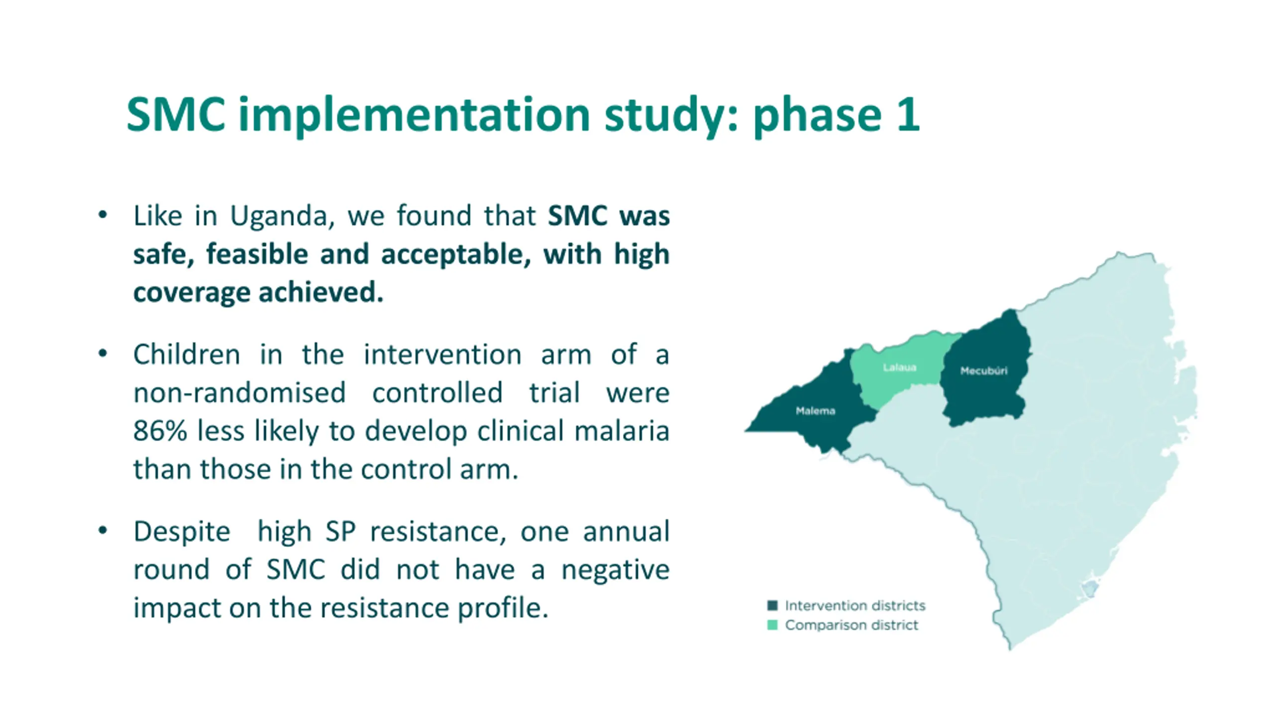 SMC implementation study: phase 1 Like in Uganda, we found that SMC was safe, feasible and acceptable, with high coverage achieved. Children in the intervention arm of a non-randomised controlled trial were 86% less likely to develop clinical malaria than those in the control arm. Despite high SP resistance, one annual round of SMC did not have a negative impact on the resistance profile.
