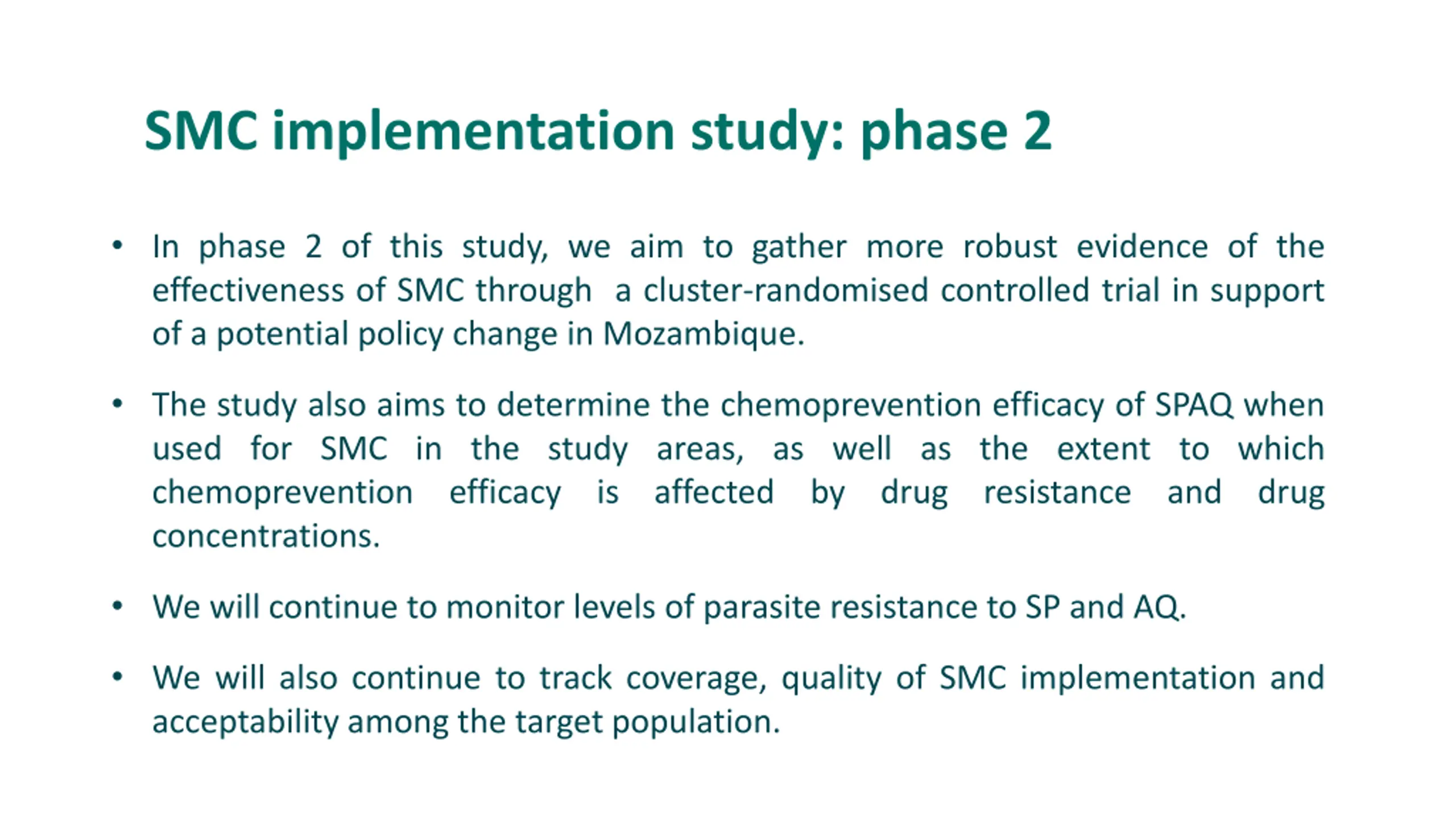 SMC implementation study: phase 2 In phase 2 of this study, we aim to gather more robust evidence of the effectiveness of SMC through a cluster-randomised controlled trial in support of a potential policy change in Mozambique. The study also aims to determine the chemoprevention efficacy of SPAQ when used for SMC in the study areas, as well as the extent to which chemoprevention efficacy is affected concentrations. by drug resistance and drug We will continue to monitor levels of parasite resistance to SP and AQ. We will also continue to track coverage, quality of SMC implementation and acceptability among the target population.