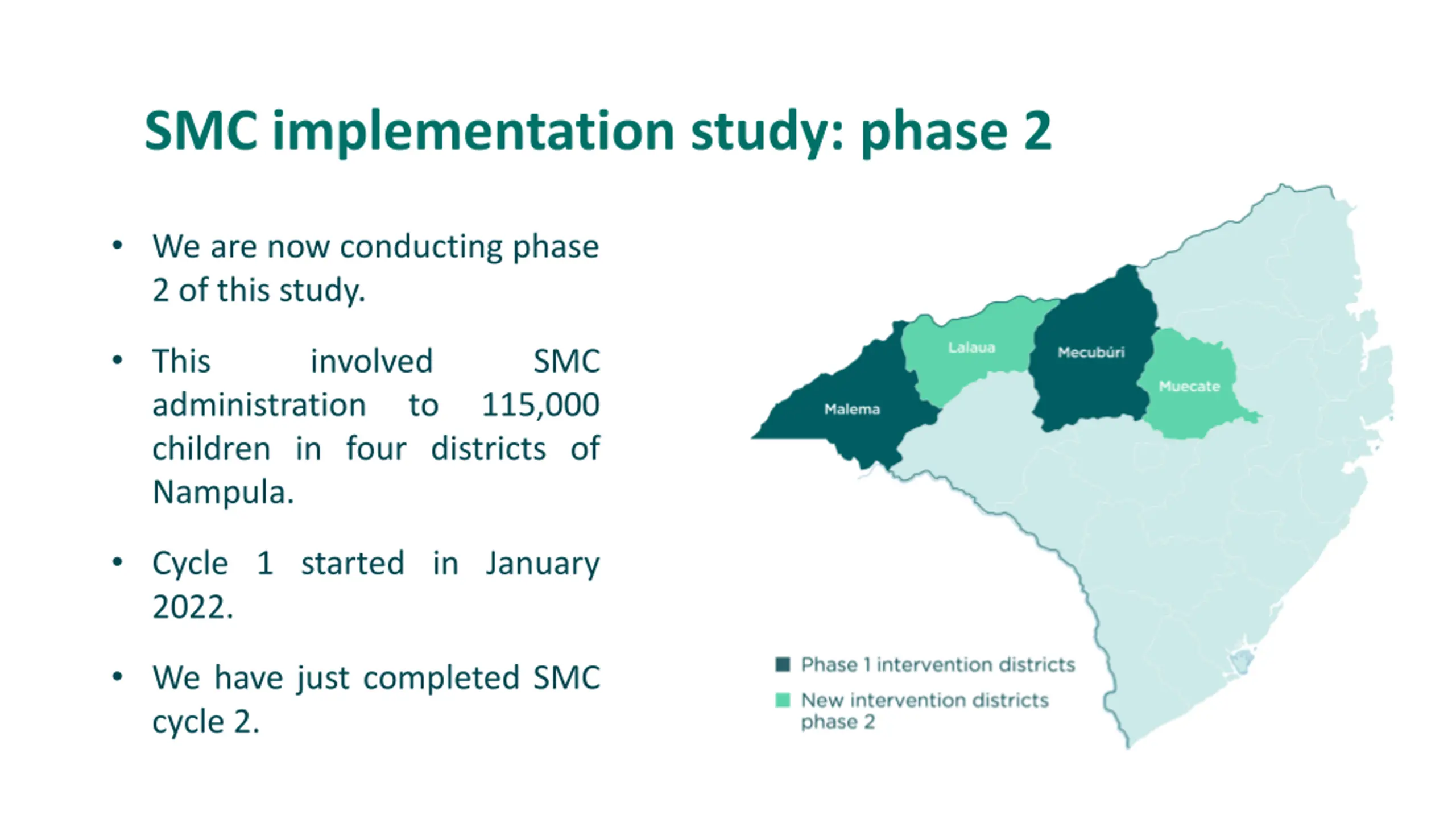 SMC implementation study: phase 2 We are now conducting phase 2 of this study. This administration children in four districts of Nampula. involved SMC to 115,000 Cycle 1 started in January 2022. We have just completed SMC cycle 2.