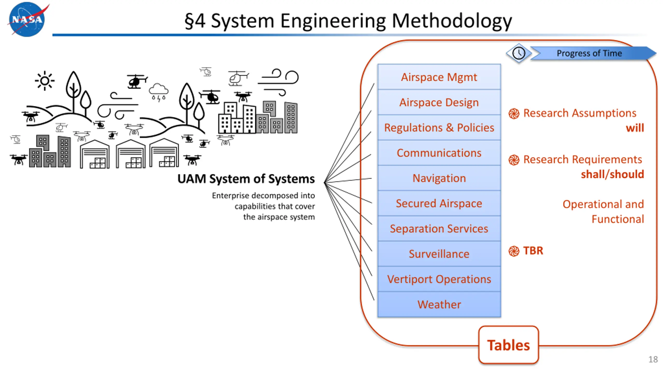 System Engineering Methodology Progress of Time Airspace Mgmt Airspace Design Research Assumptions Regulations & Policies will Communications Research Requirements shall/should UAM System of Systems Navigation Enterprise decomposed into capabilities that cover the airspace system Secured Airspace Operational and Functional Separation Services TBR Surveillance Vertiport Operations Weather 17