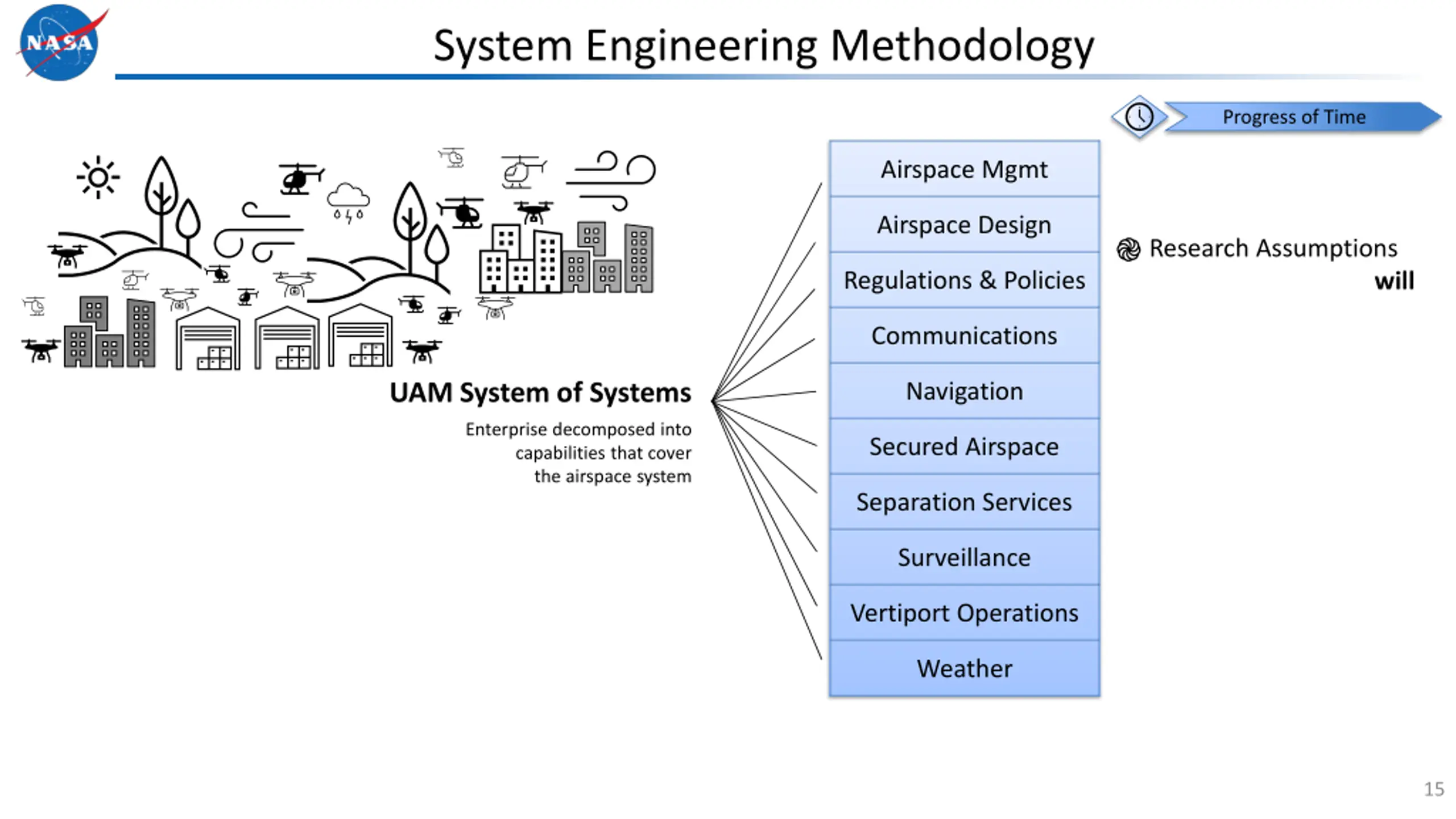System Engineering Methodology Airspace Mgmt Airspace Design Regulations & Policies Communications UAM System of Systems Navigation Enterprise decomposed into capabilities that cover the airspace system Secured Airspace Separation Services Surveillance Vertiport Operations Weather 14