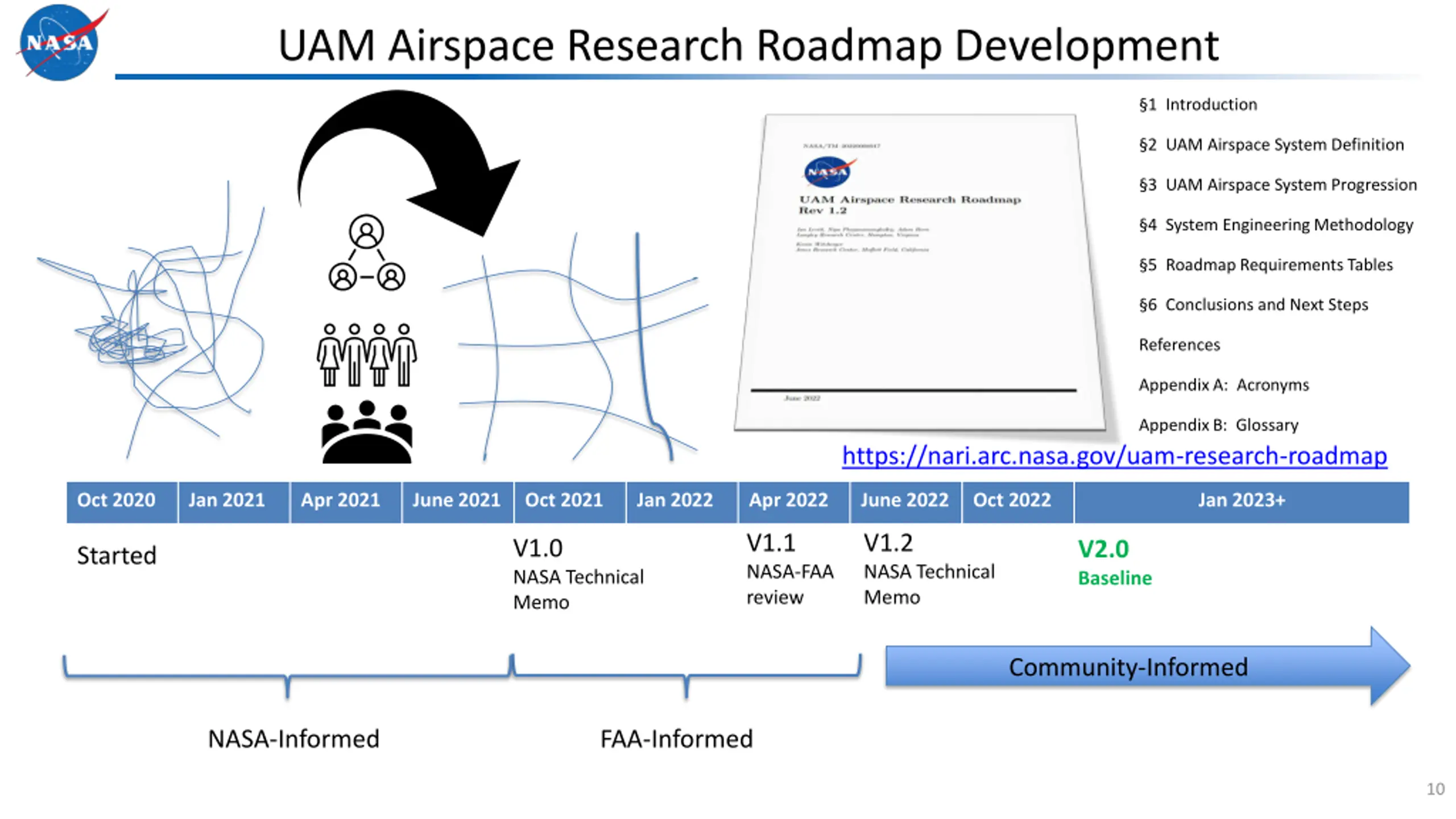 UAM Airspace Research Roadmap Development 1 Introduction 2 UAM Airspace System Definition 3 UAM Airspace System Progression 4 System Engineering Methodology 5 Roadmap Requirements Tables 6 Conclusions and Next Steps References Appendix A: Acronyms Appendix B: Glossary https://nari.arc.nasa.gov/uam-research-roadmap Oct 2020 Jan 2021 Apr 2021 June 2021 Oct 2021 Jan 2022 Apr 2022 June 2022 Oct 2022 Jan 2023+ V1.1 NASA-FAA review V1.2 NASA Technical Memo V1.0 NASA Technical Memo Started Community-Informed NASA-Informed FAA-Informed 9