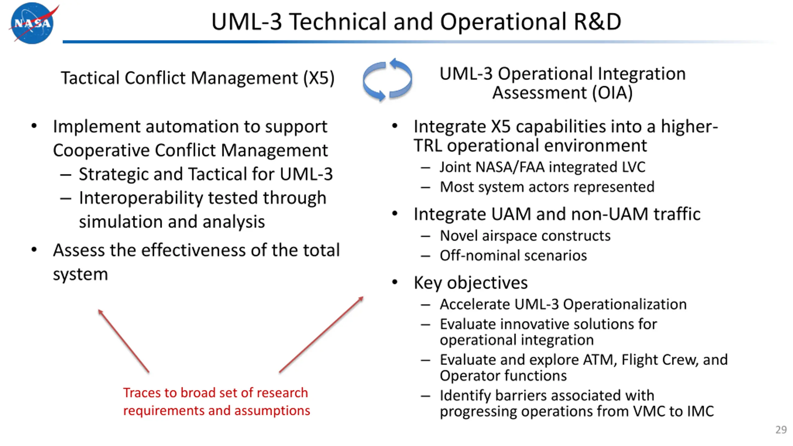 UML-3 Technical and Operational R&D UML-3 Operational Integration Assessment (OIA) Tactical Conflict Management (X5) Integrate X5 capabilities into a higher- TRL operational environment Joint NASA/FAA integrated LVC Most system actors represented Integrate UAM and non-UAM traffic Novel airspace constructs Off-nominal scenarios Key objectives Accelerate UML-3 Operationalization Evaluate innovative solutions for operational integration Evaluate and explore ATM, Flight Crew, and Operator functions Identify barriers associated with progressing operations from VMC to IMC Implement automation to support Cooperative Conflict Management Strategic and Tactical for UML-3 Interoperability tested through simulation and analysis Assess the effectiveness of the total system 28