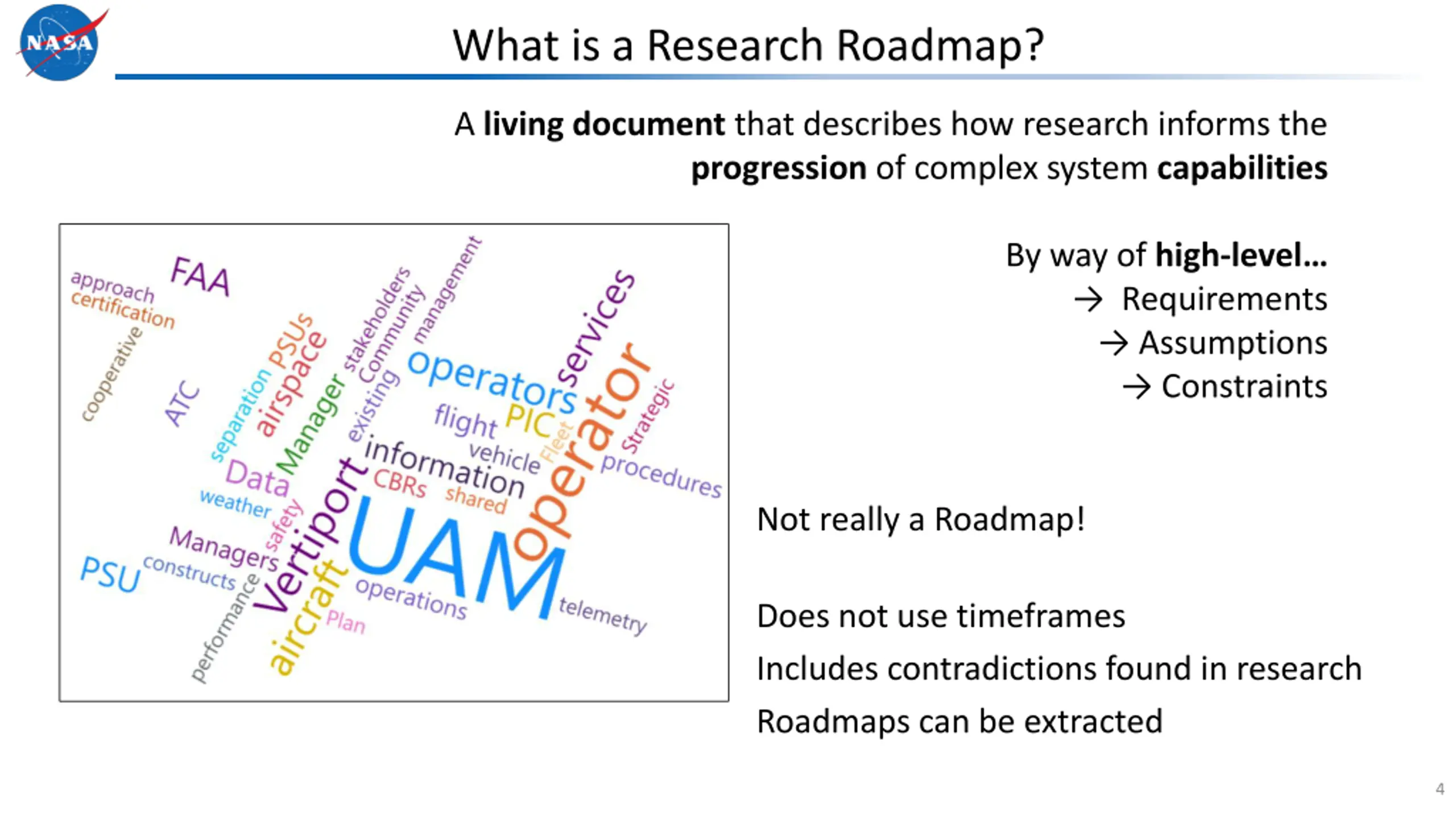 What is a Research Roadmap? A living document that describes how research informs the progression of complex system capabilities By way of high-level Requirements Assumptions Constraints 3