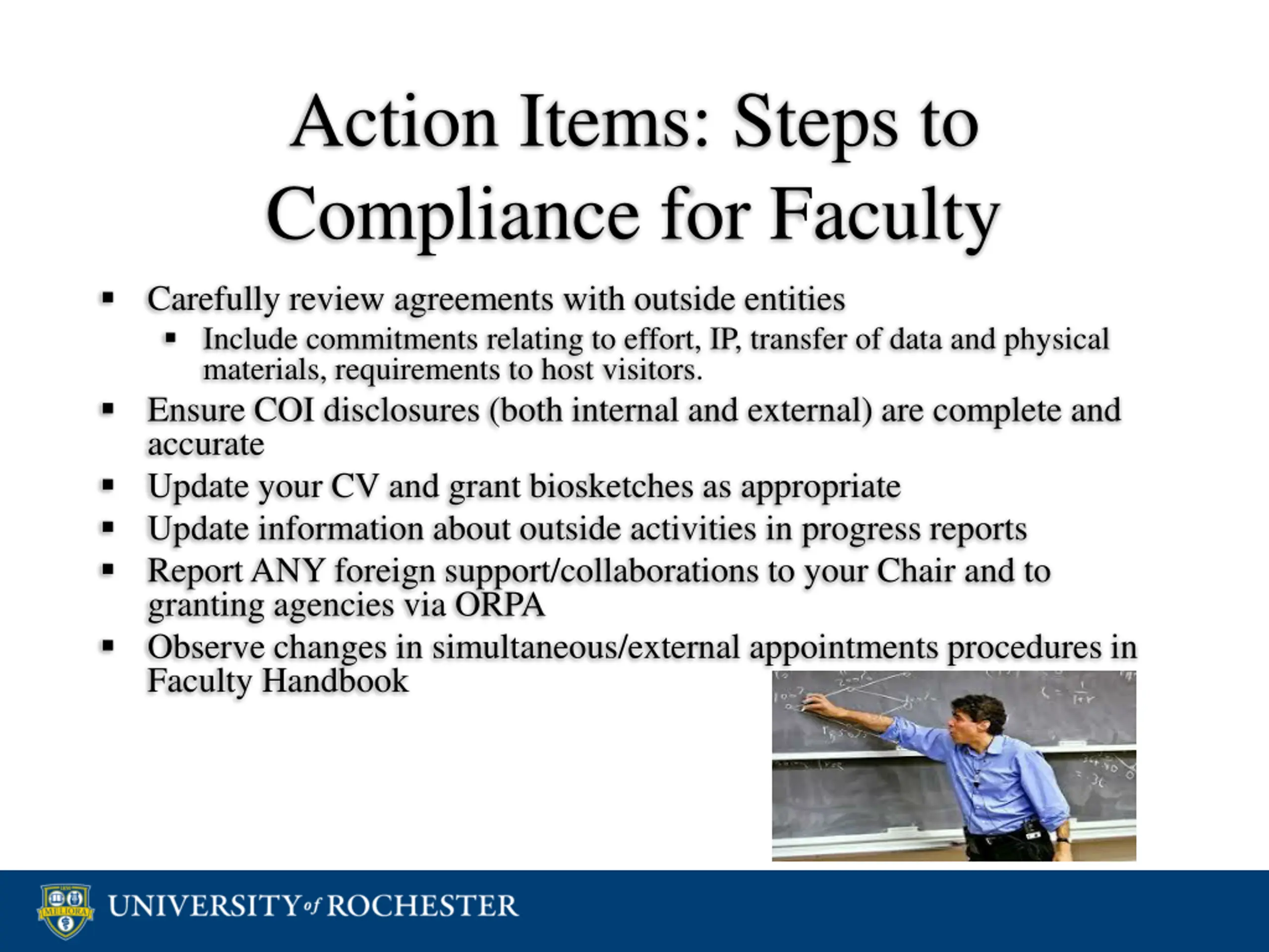 Action Items: Steps to Compliance for Faculty Carefully review agreements with outside entities Include commitments relating to effort, IP, transfer of data and physical materials, requirements to host visitors. Ensure COI disclosures (both internal and external) are complete and accurate Update your CV and grant biosketches as appropriate Update information about outside activities in progress reports Report ANY foreign support/collaborations to your Chair and to granting agencies via ORPA Observe changes in simultaneous/external appointments procedures in Faculty Handbook