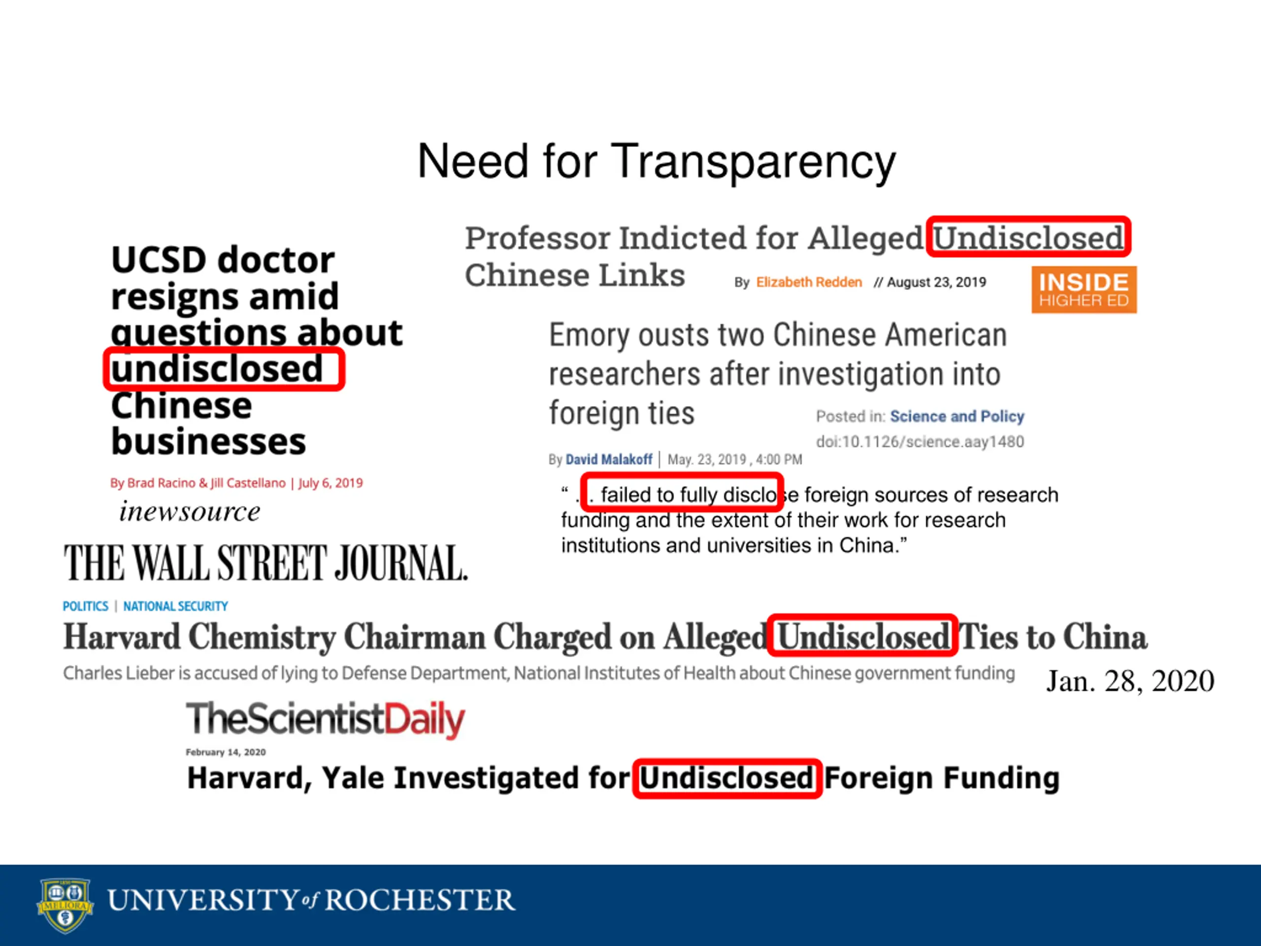 NSPM-33 Disclosure Requirements Organizational affiliation and appointments Other support includesallresources made available to a researcher in support of and/or related to all of their professional R&D efforts, including resources provided directly to the individual rather than through the research institution, and regardless of whether or not they have monetary value (e.g., even if the support received is only in-kind, such as office/laboratory space, equipment, supplies, or employees) Current or pending participation in, or applications to, programs sponsored by foreign governments, instrumentalities, or entities, including foreign government-sponsored talent recruitment programs Positions and appointments, both domestic and foreign, including affiliations with foreign entities or governments. This includes titled academic, professional, or institutional appointments whether or not remuneration is received, and whether full-time, part-time, or voluntary (including adjunct, visiting, or honorary)