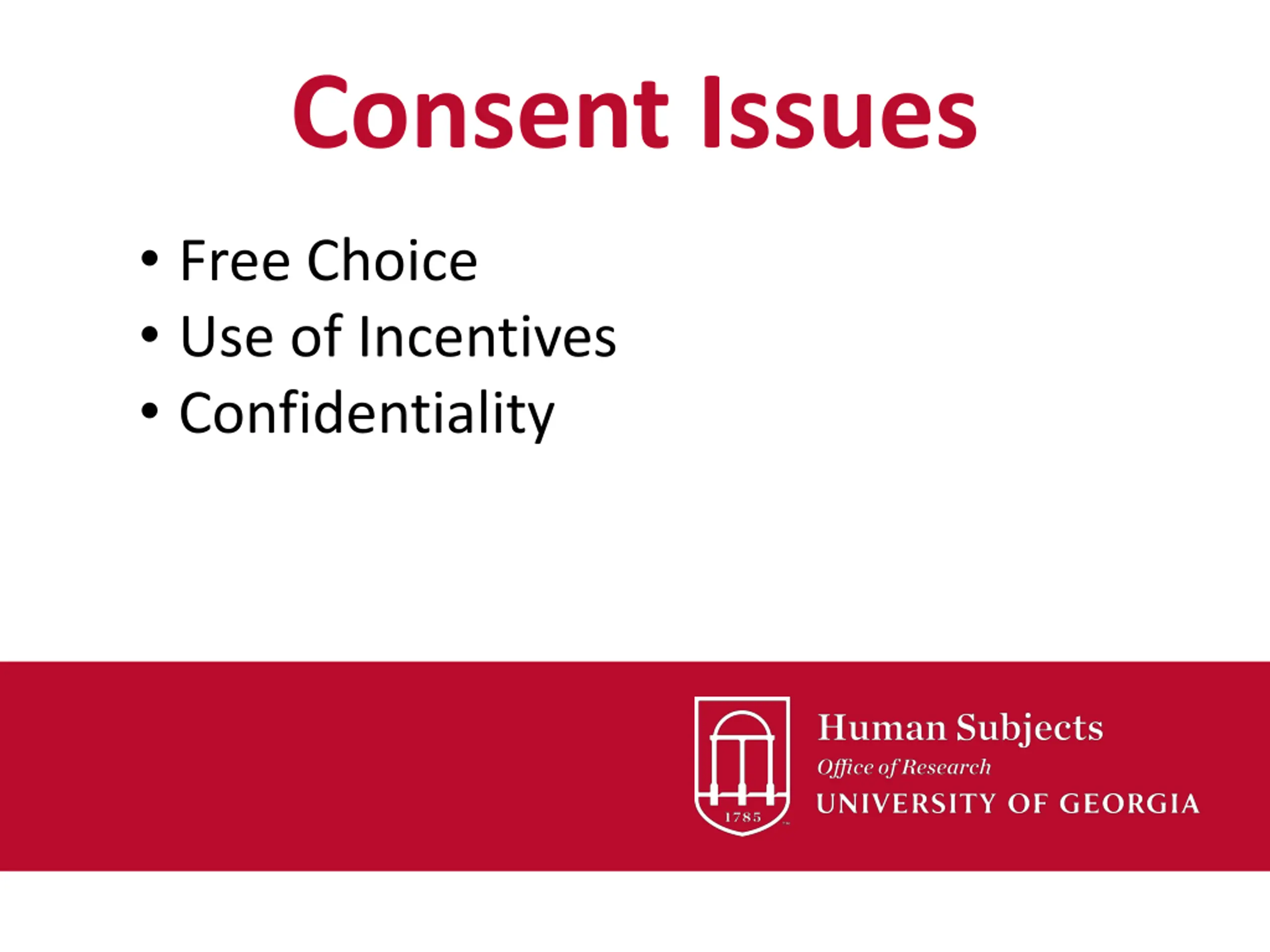 Consent Issues Free Choice Use of Incentives Confidentiality