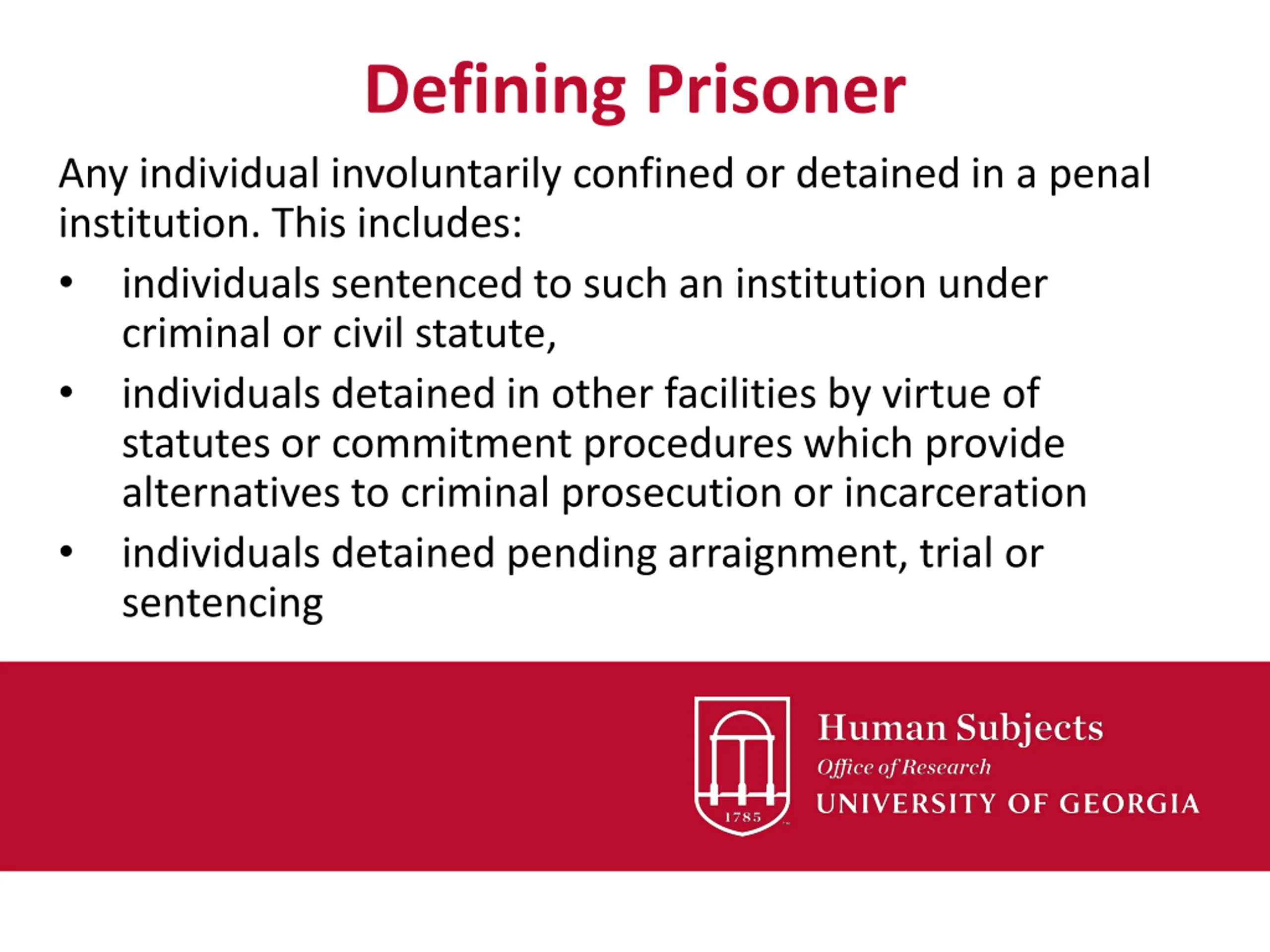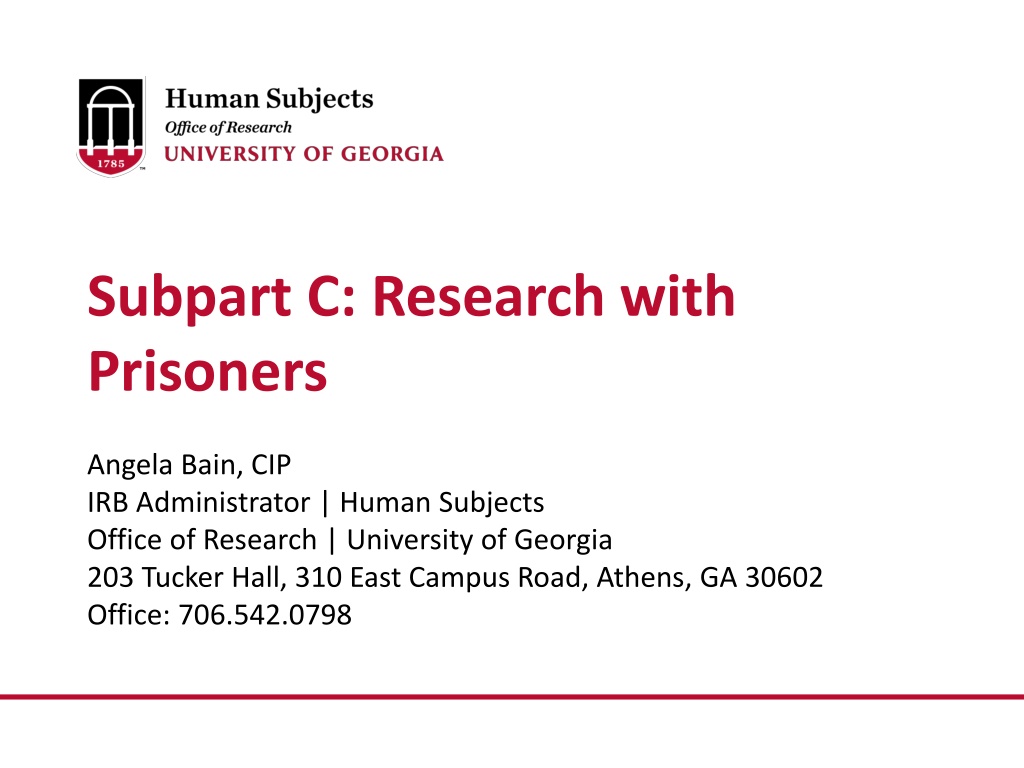 Subpart C: Research with Prisoners Angela Bain, CIP IRB Administrator | Human Subjects Office of Research | University of Georgia 203 Tucker Hall, 310 East Campus Road, Athens, GA 30602 Office: 706.542.0798