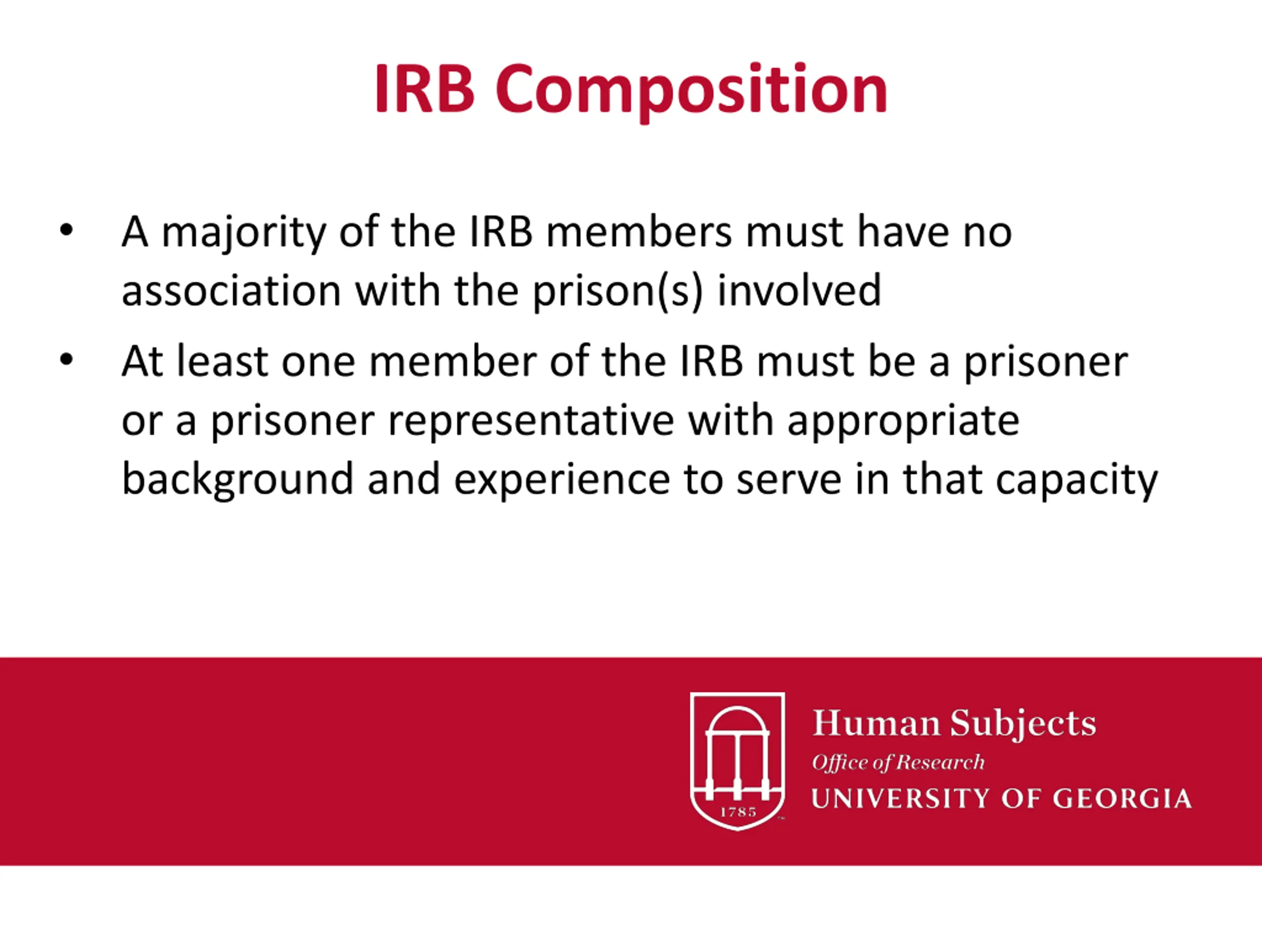 IRB Composition A majority of the IRB members must have no association with the prison(s) involved At least one member of the IRB must be a prisoner or a prisoner representative with appropriate background and experience to serve in that capacity