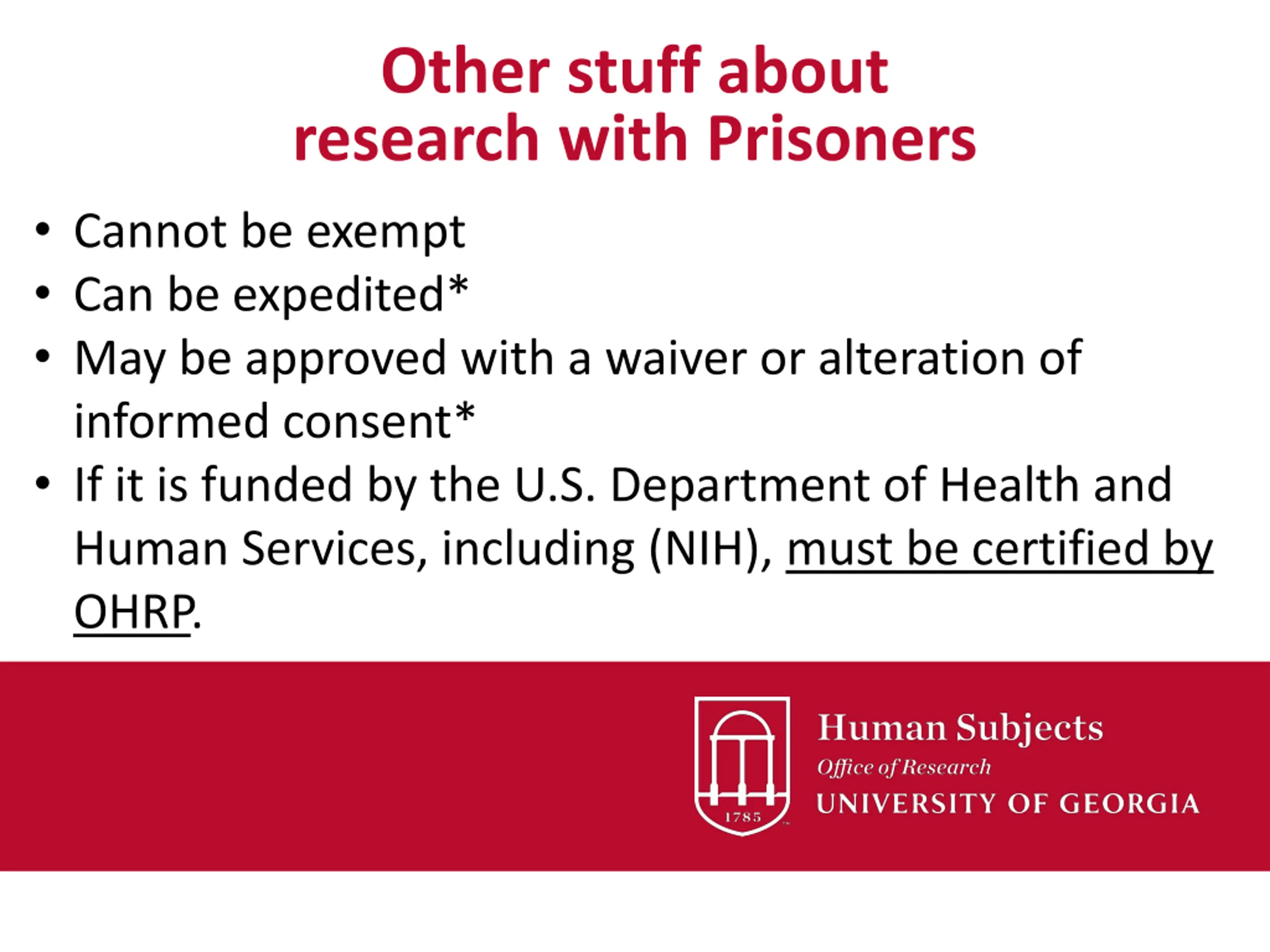 Other stuff about research with Prisoners Cannot be exempt Can be expedited* May be approved with a waiver or alteration of informed consent* If it is funded by the U.S. Department of Health and Human Services, including (NIH), must be certified by OHRP.